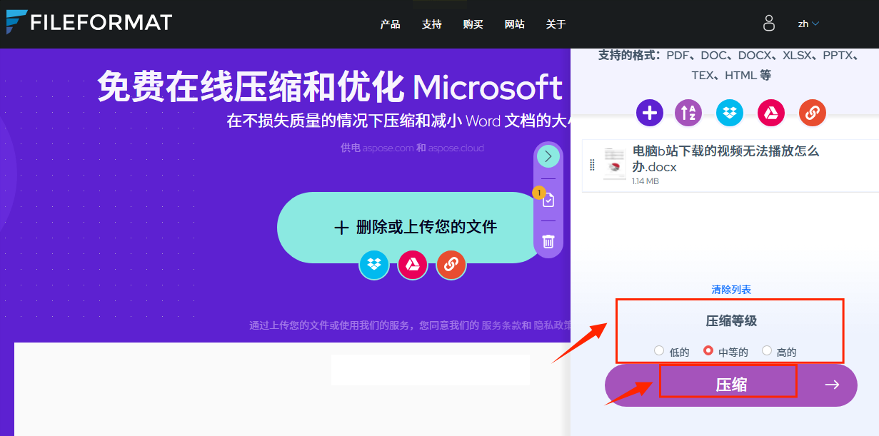 1. 上传文件:打开浏览器进入FileFormat网站(不需要下载任何软件!),首页就能看到"Word压缩"入口。你可以直接拖文件到页面,或者用左侧的上传按钮选本地文件,甚至支持DropBox、Google Drive这些云盘链接导入,简直是多平台用户的福音。