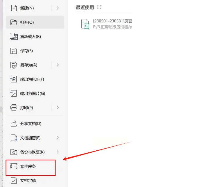 2. 看软件左上角,有个“文件”菜单,点开它。在下拉列表里找一找,你会发现一个叫“文件瘦身”或者“文档瘦身”的功能,点击它。
