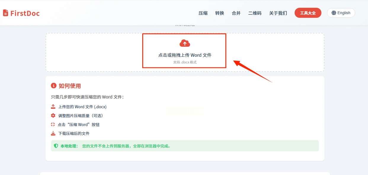 1. 访问在线平台:打开浏览器,进入FirstDoc官网,点击首页的"Word压缩"功能入口。