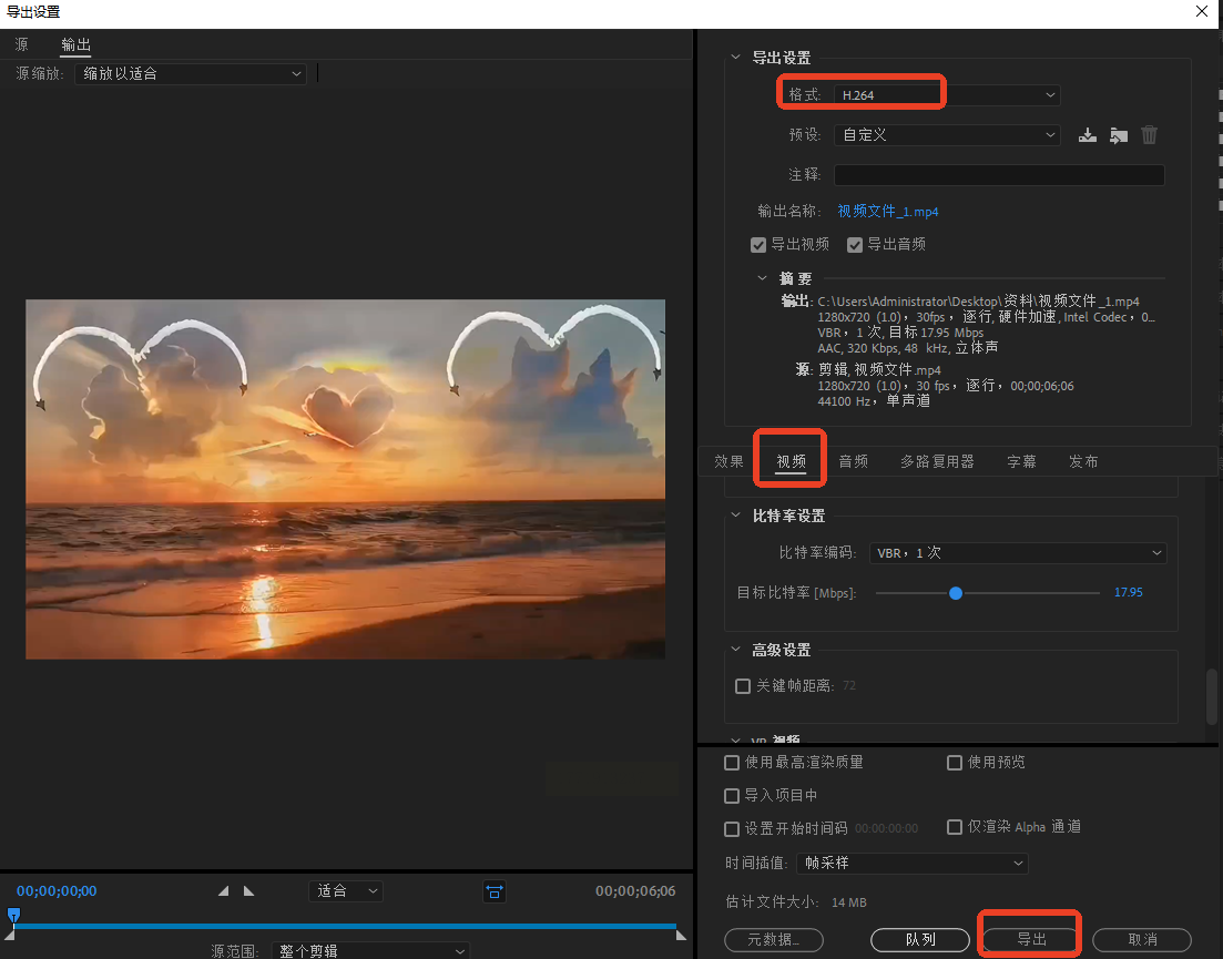 - 格式:选择“H.264”(支持多平台适配);