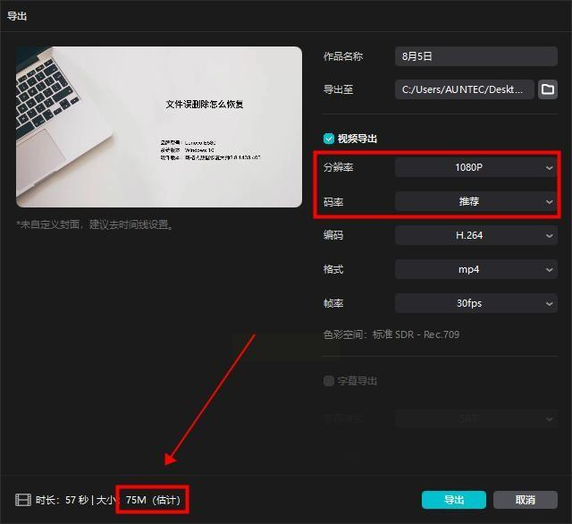 - 码率设置:在“设置”面板找到“导出参数”,将“码率”从推荐值(如8Mbps)降至5-6Mbps;