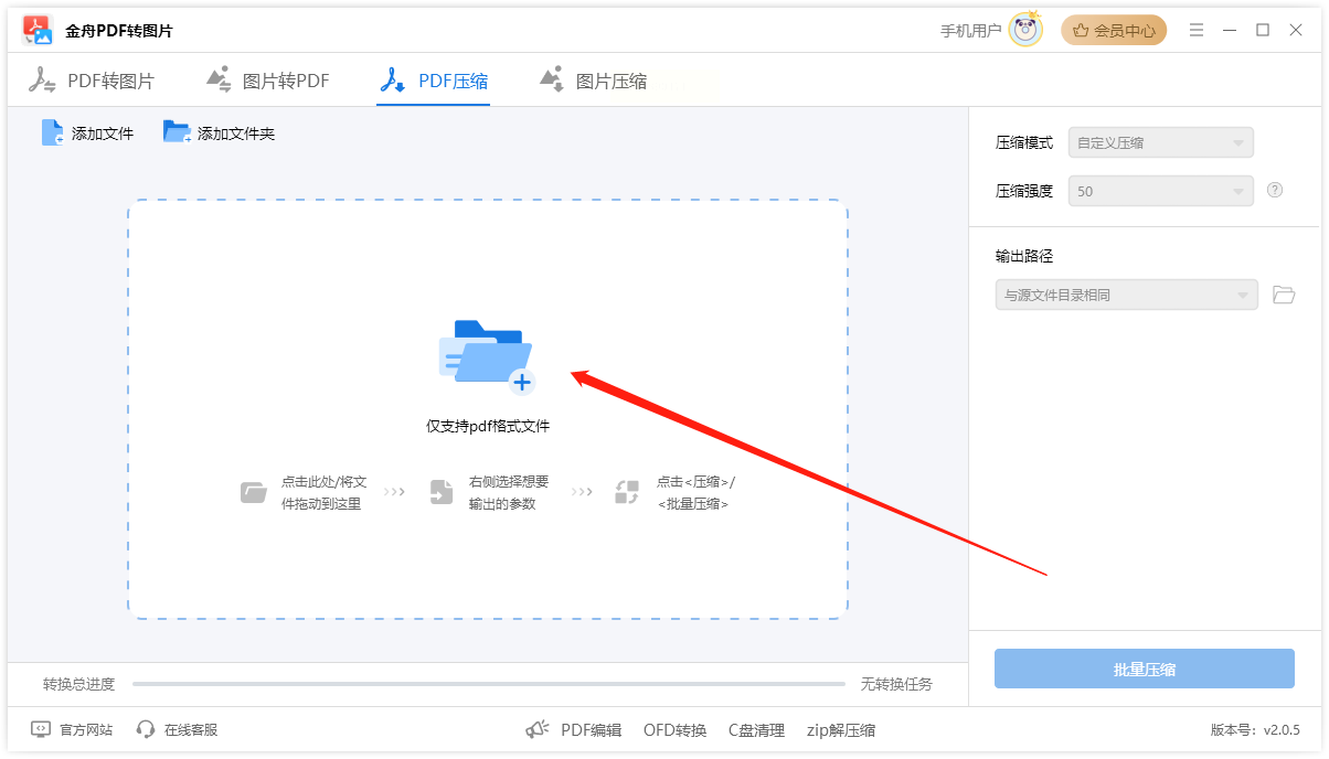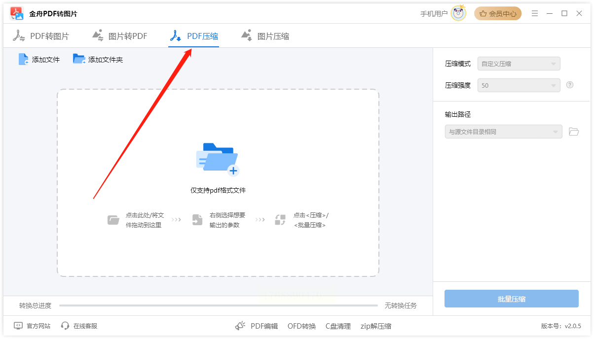 步骤二: 在页面找到“PDF压缩”功能,点击上传你的文件。网站通常支持拖拽上传,非常方便。