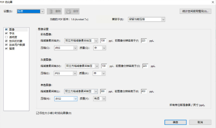 * “压缩”标签页: 可以分别设置彩色、灰度、单色图像的压缩算法和采样分辨率,精确控制。