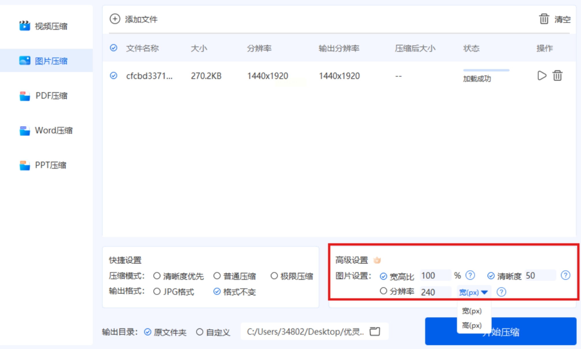 7. 开始压缩:点击“开始压缩”按钮,等待处理完成后,即可在指定目录中找到压缩后的文件。