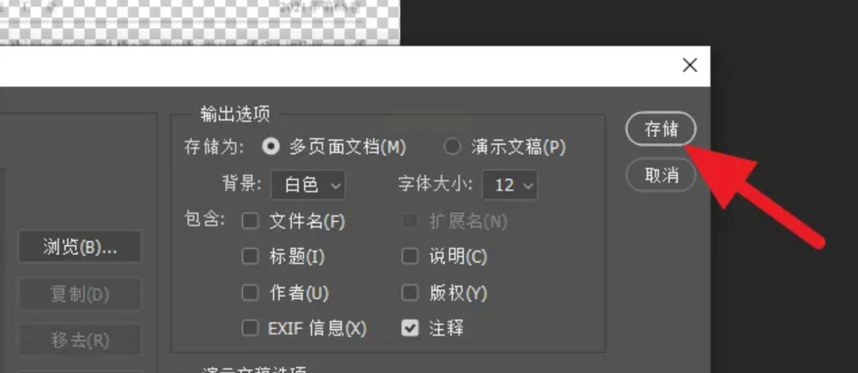 3. 保存文件:设置好后,点击“存储”按钮,选择保存路径并命名文件,系统将自动将PSD文件转换为PDF格式,从而实现文件压缩。