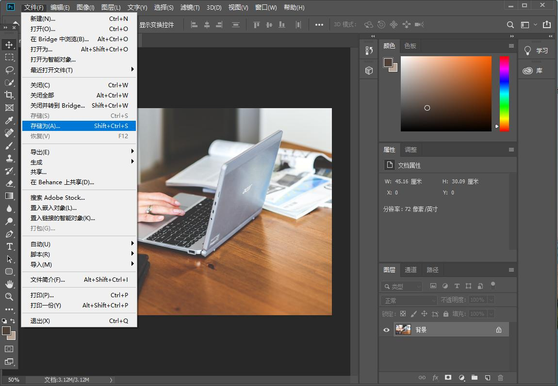 1. 打开图片后,点击顶部菜单“文件”→“存储为Web所用格式”;