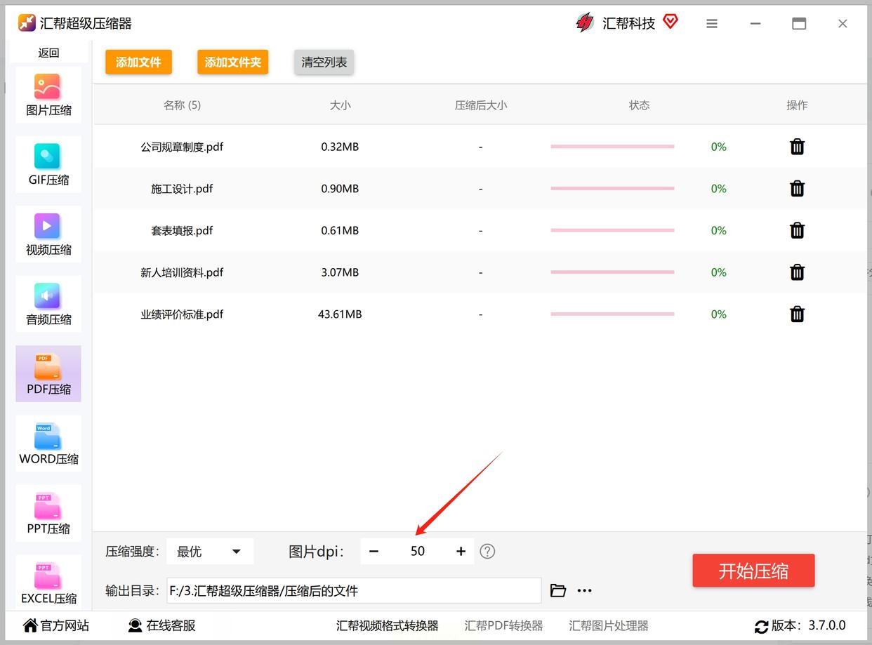 6. 开始压缩:点“开始压缩”,等进度条走完,就能看到压缩后的文件大小了。我上次一个15MB的PDF,压缩后只剩3.2MB,速度超快!如果还想更小,就把分辨率再调低,再压缩一次。