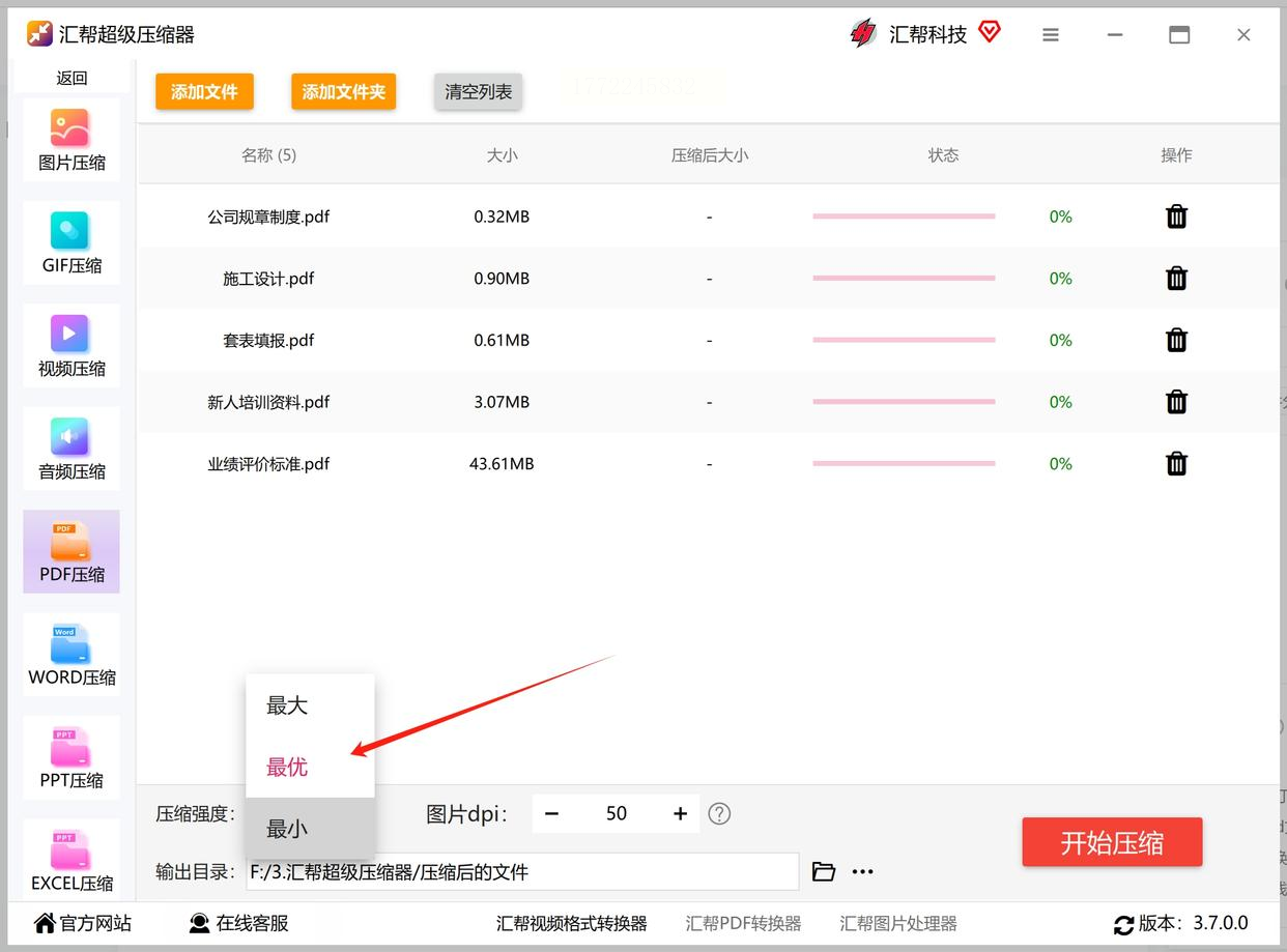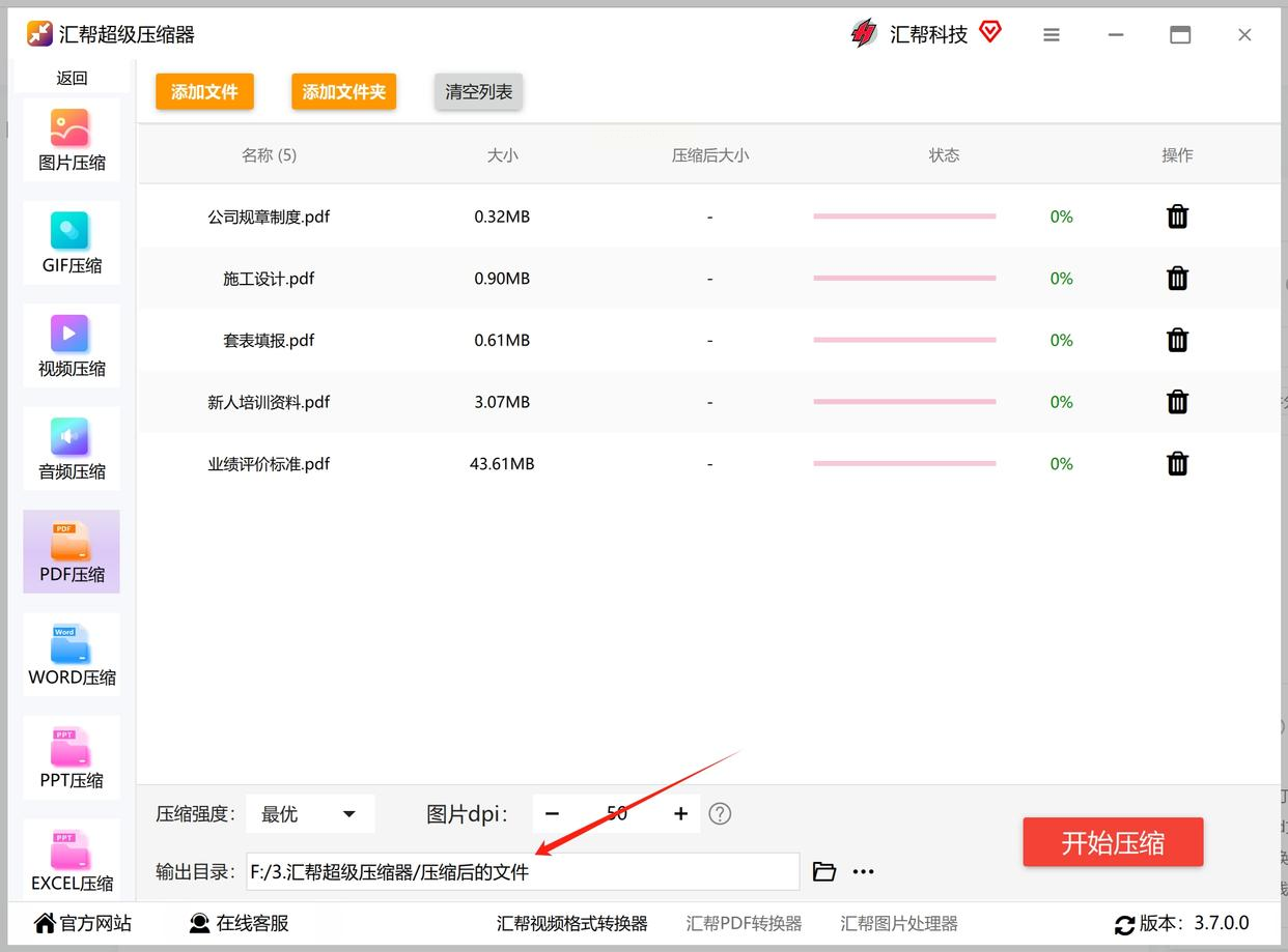 5. 选保存位置:记得在“输出目录”里选个好记的文件夹,比如桌面上建个“压缩后PDF”文件夹,压缩完直接能找到。