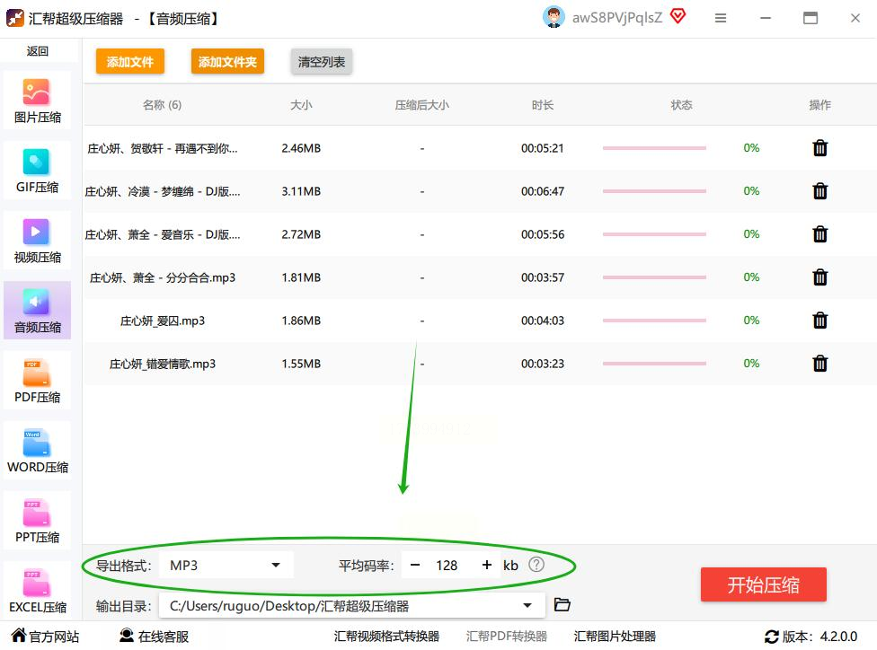 - 码率设置:这是压缩的关键!语音类音频建议选择“中等”码率(128-160kbps),音乐类可尝试“高质量”(192-256kbps),避免过度压缩导致音质失真。