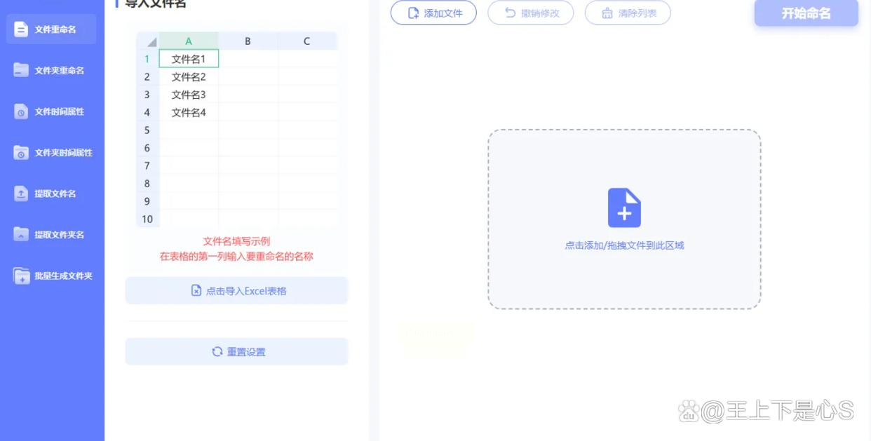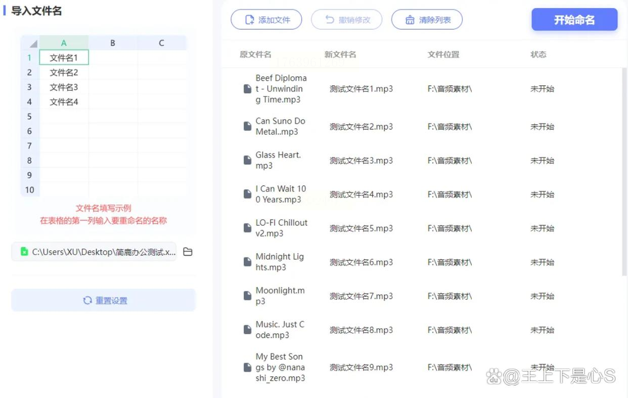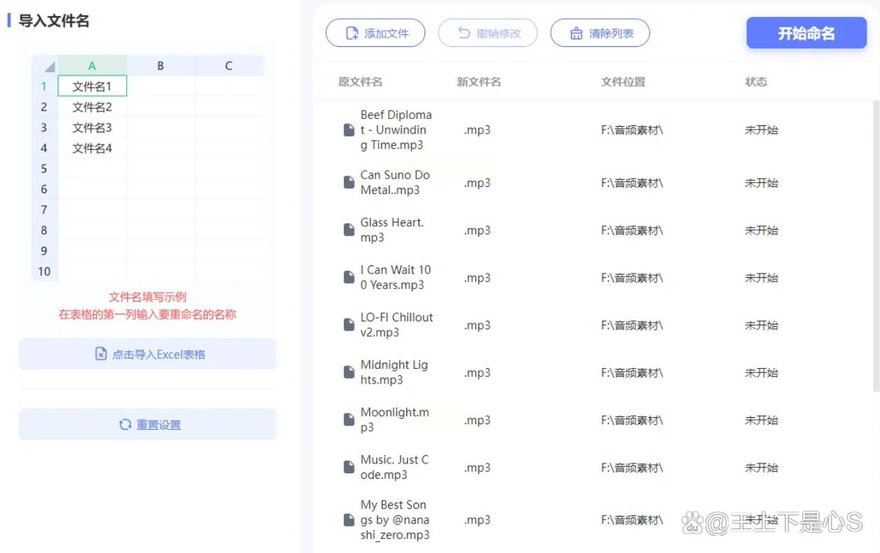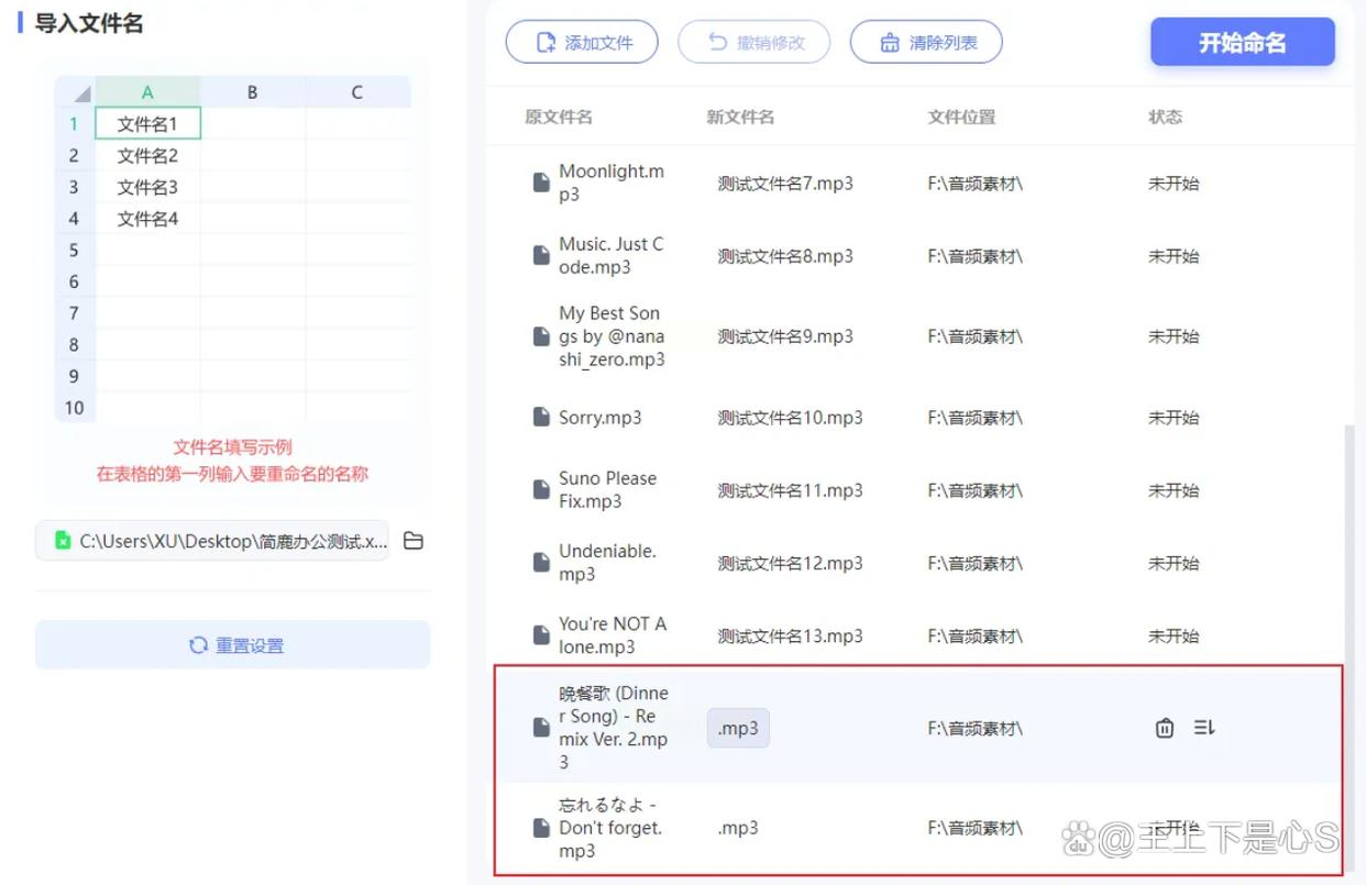 在软件右侧找到「命名设置」,点「导入」→「导入Excel表格」,选中你刚才准备的`新名称列表.xlsx`。软件会自动匹配第一列的新名称,左边显示旧文件名,右边显示新文件名,一目了然!
