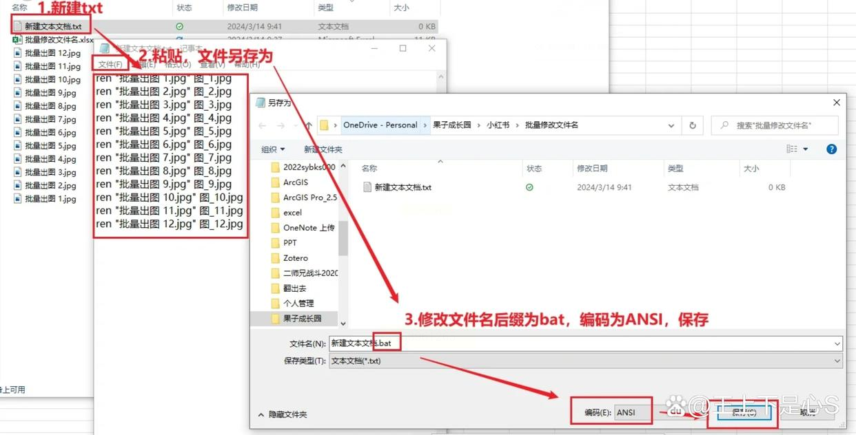 复制D列所有公式(就是那些带`ren`的命令),打开记事本(直接按`Win+R`输入`notepad`),粘贴进去。然后点「文件」→「另存为」,在保存类型里选「所有文件」,文件名写`批量改名.bat`,编码选`ANSI`(避免中文乱码),最后点保存。
