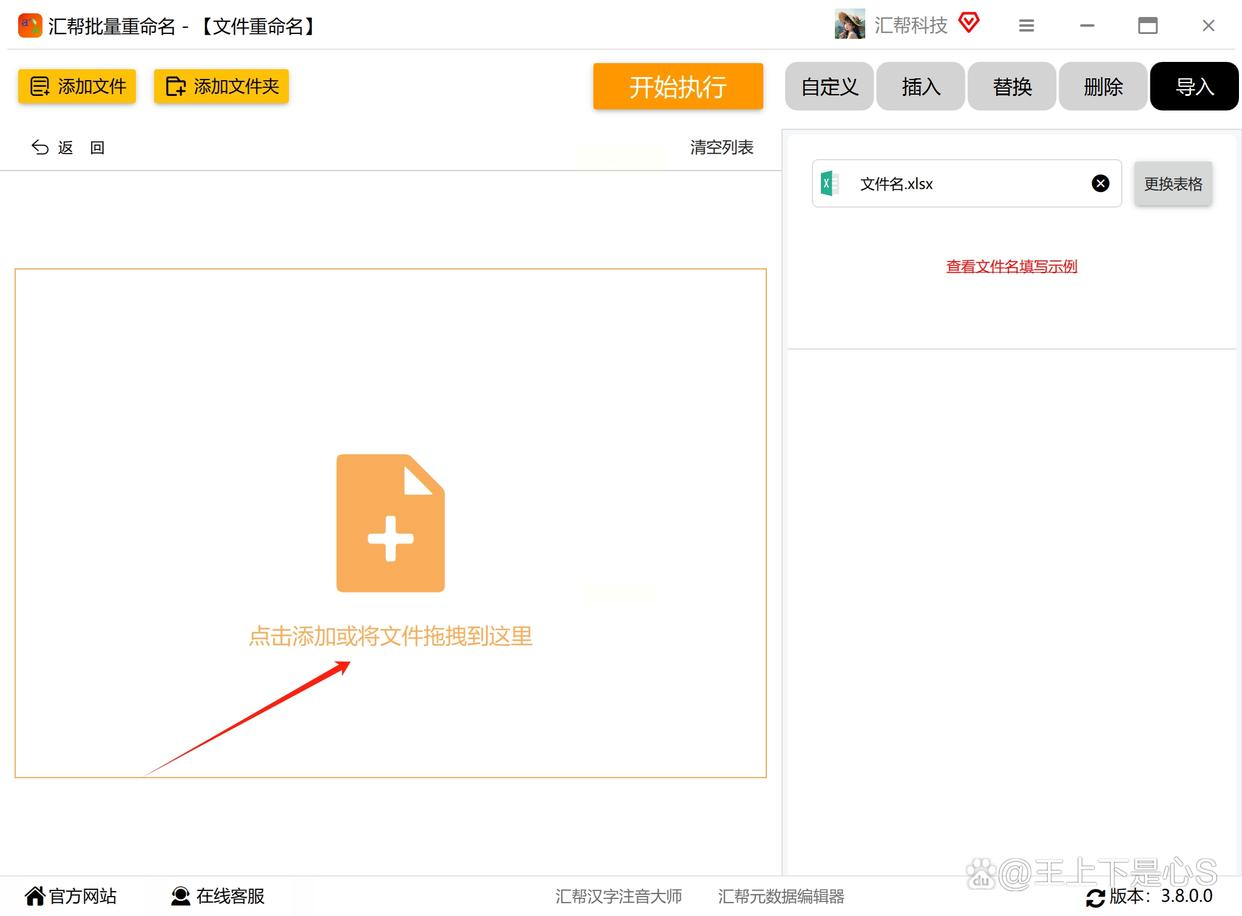 打开「汇帮批量重命名」,选「文件重命名」功能,直接把文件夹里的文件拖到软件窗口里(或者点「添加文件」多选),文件会自动显示在列表里。