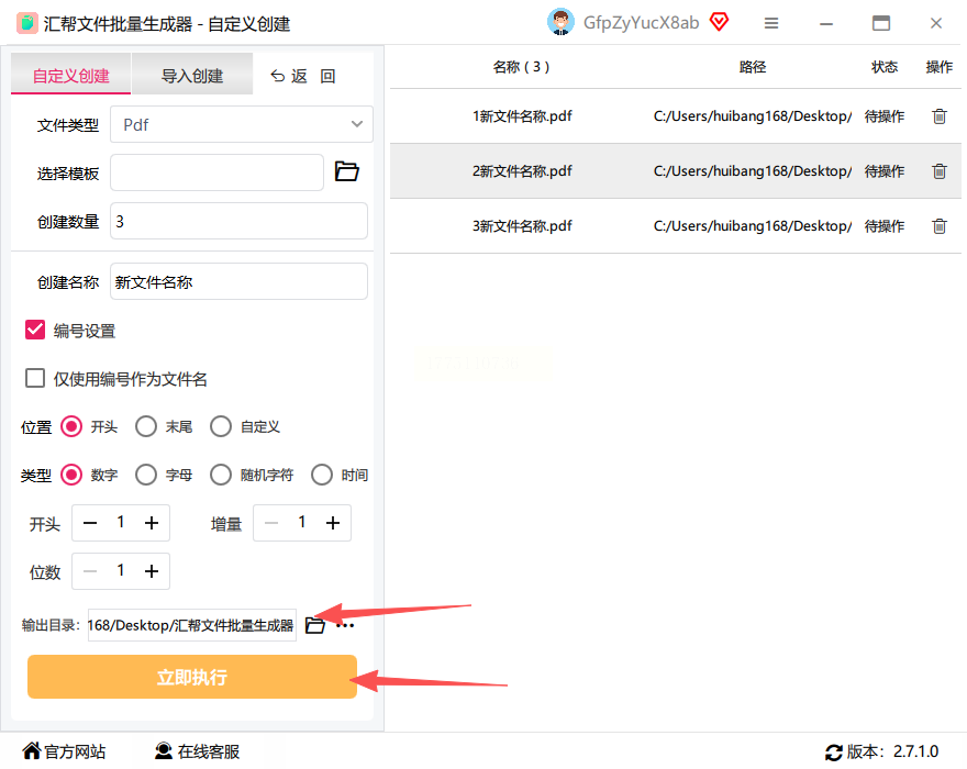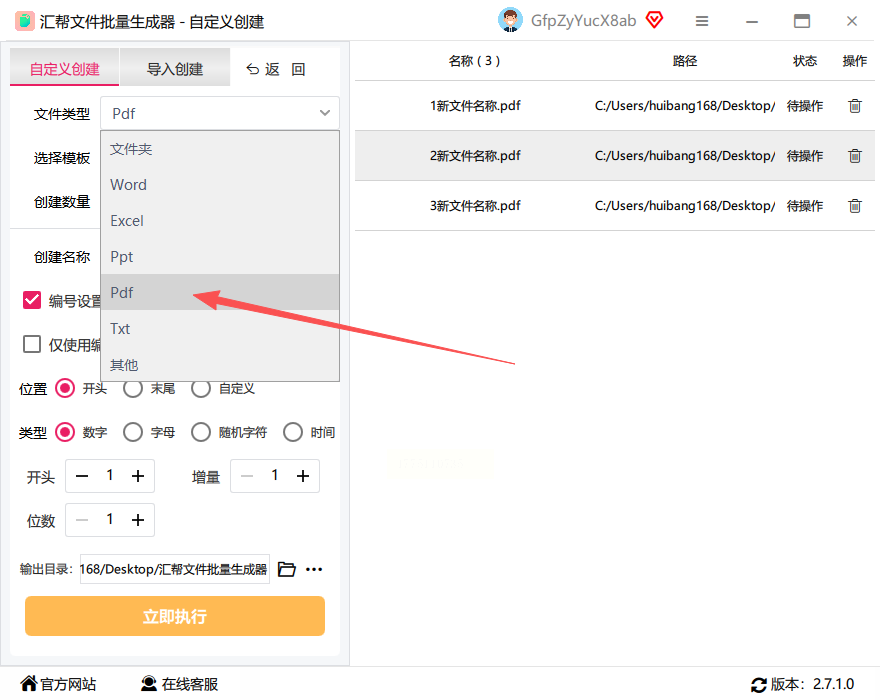 打开电脑中的汇帮文件批量生成器,选择"自定义创建进入"选项。该工具启动后界面简洁,主要功能区清晰可见,适合新手快速上手批量创建PDF。