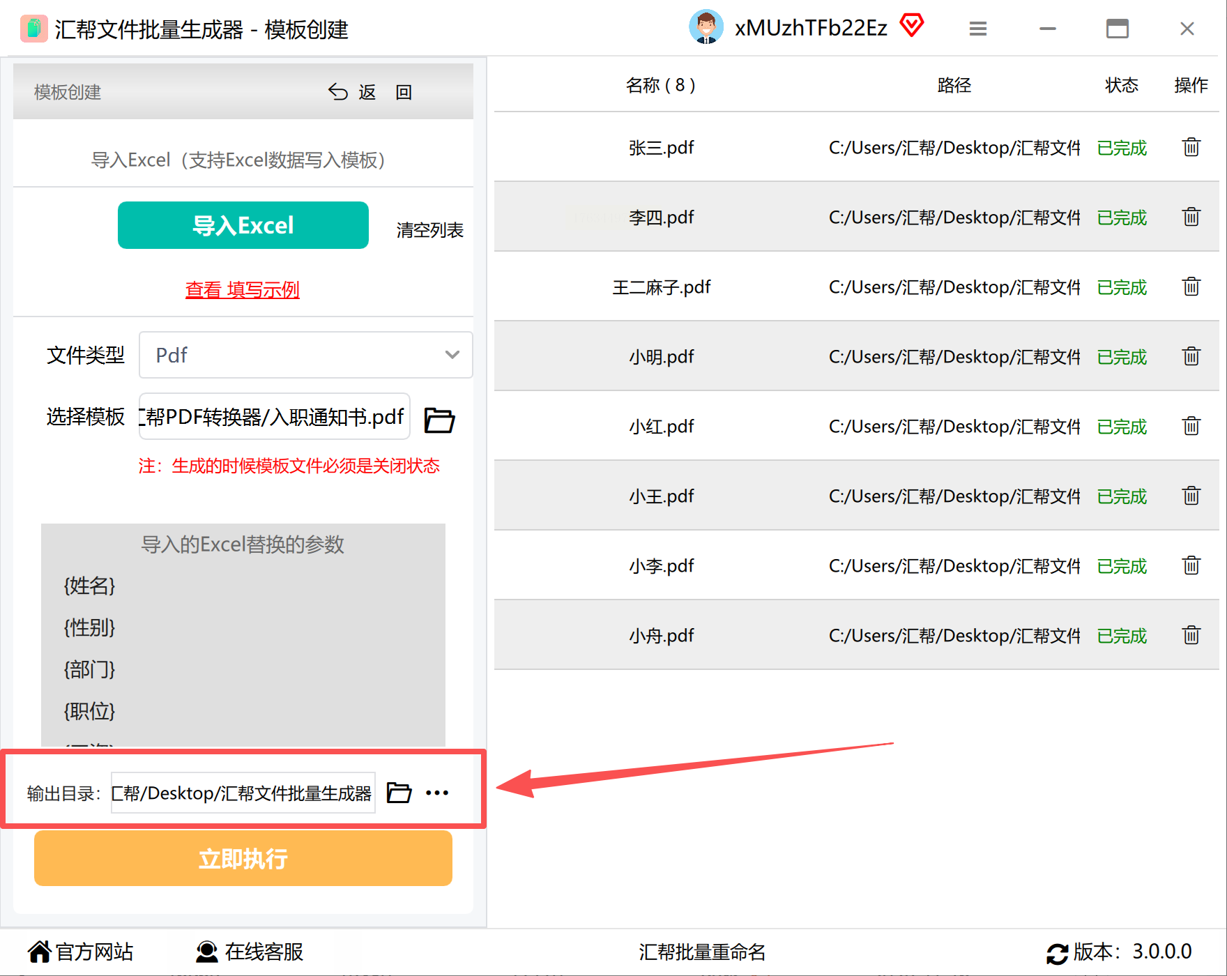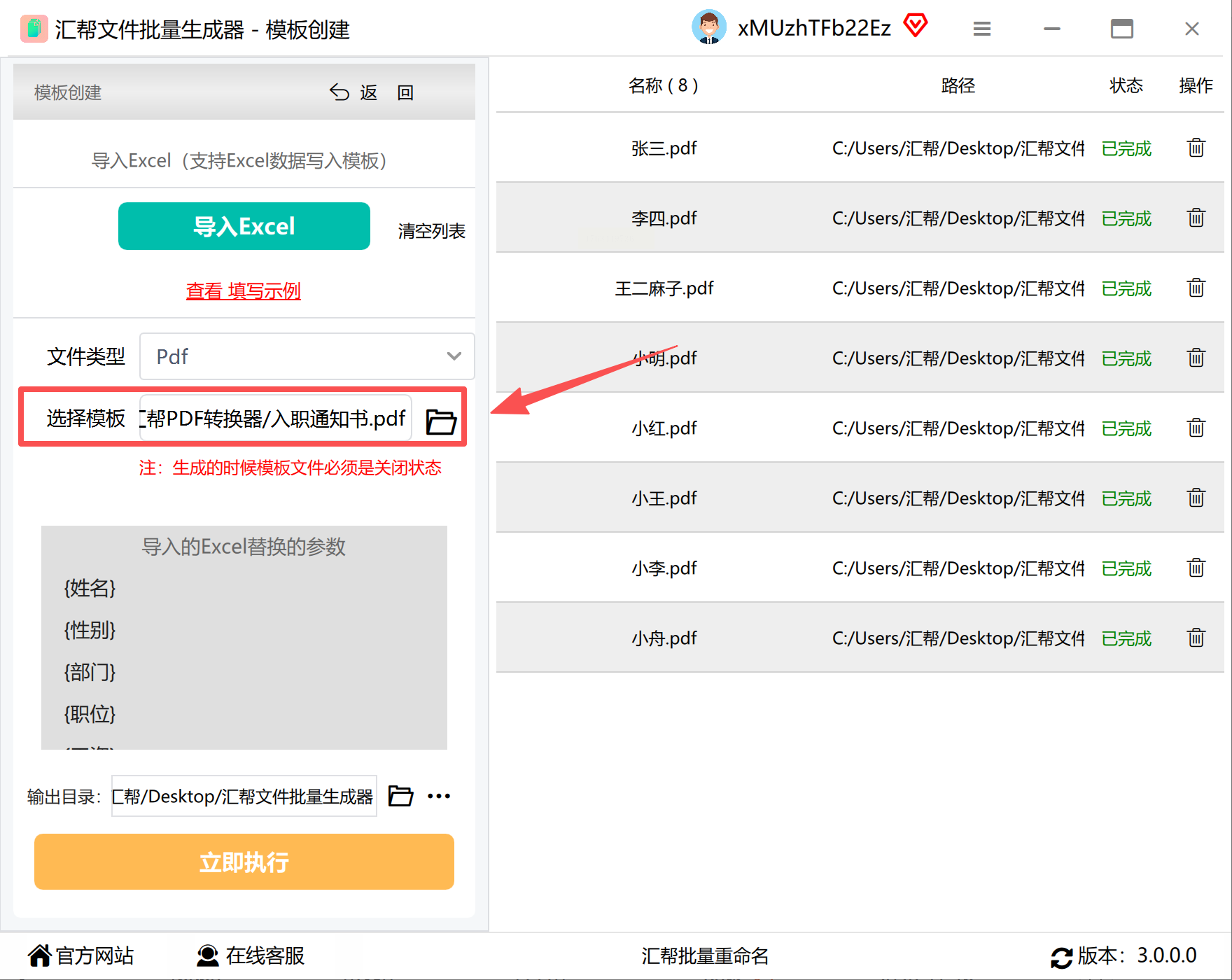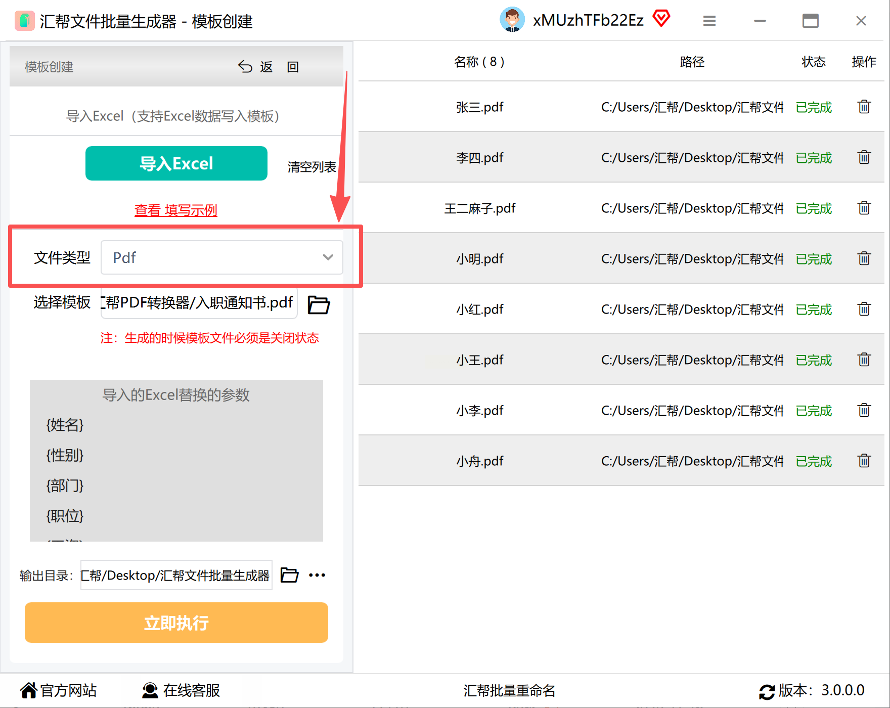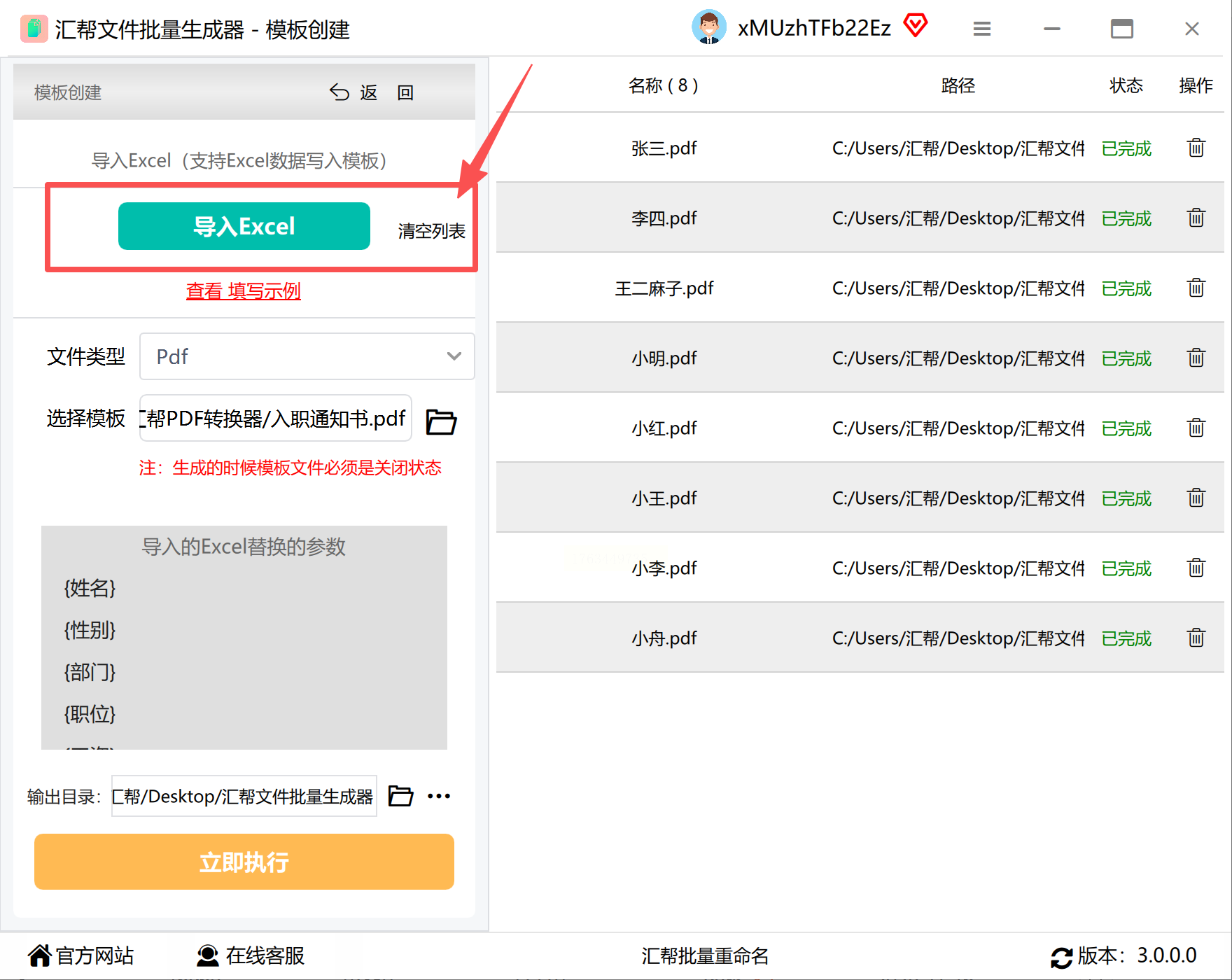 - PDF模板需在对应位置插入{变量名}格式的占位符,确保与Excel列名一一对应