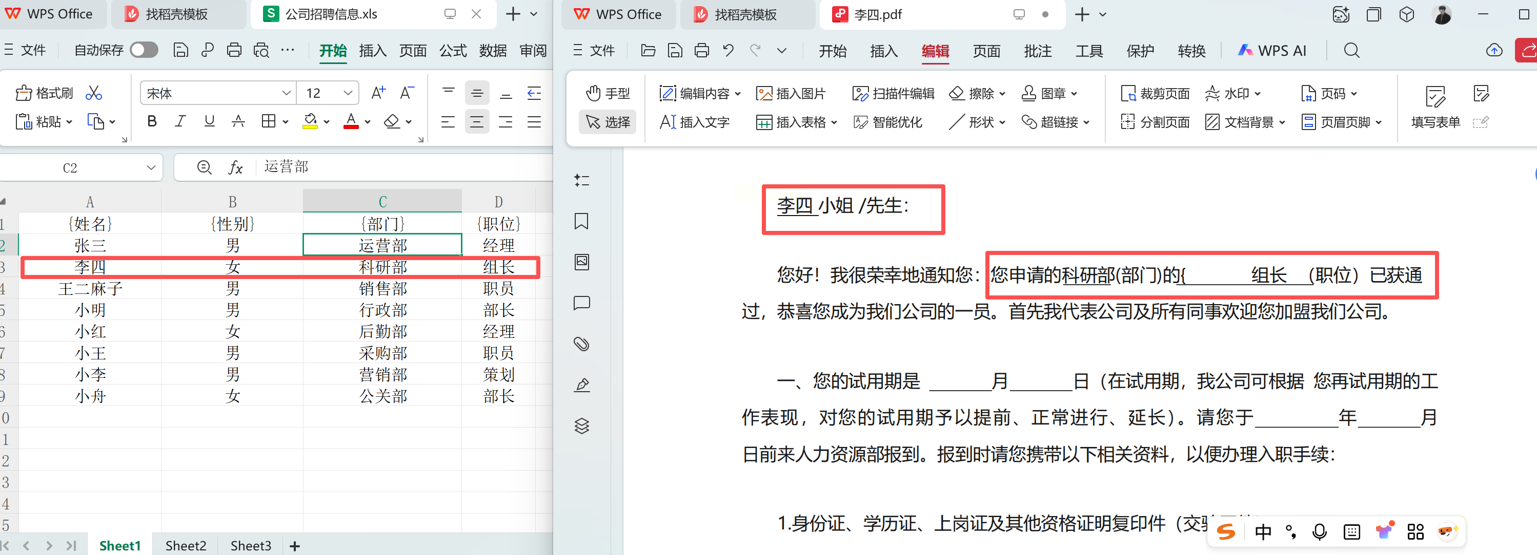- 通过「数据」→「合并到文档」功能选择模板,一键生成多份文档