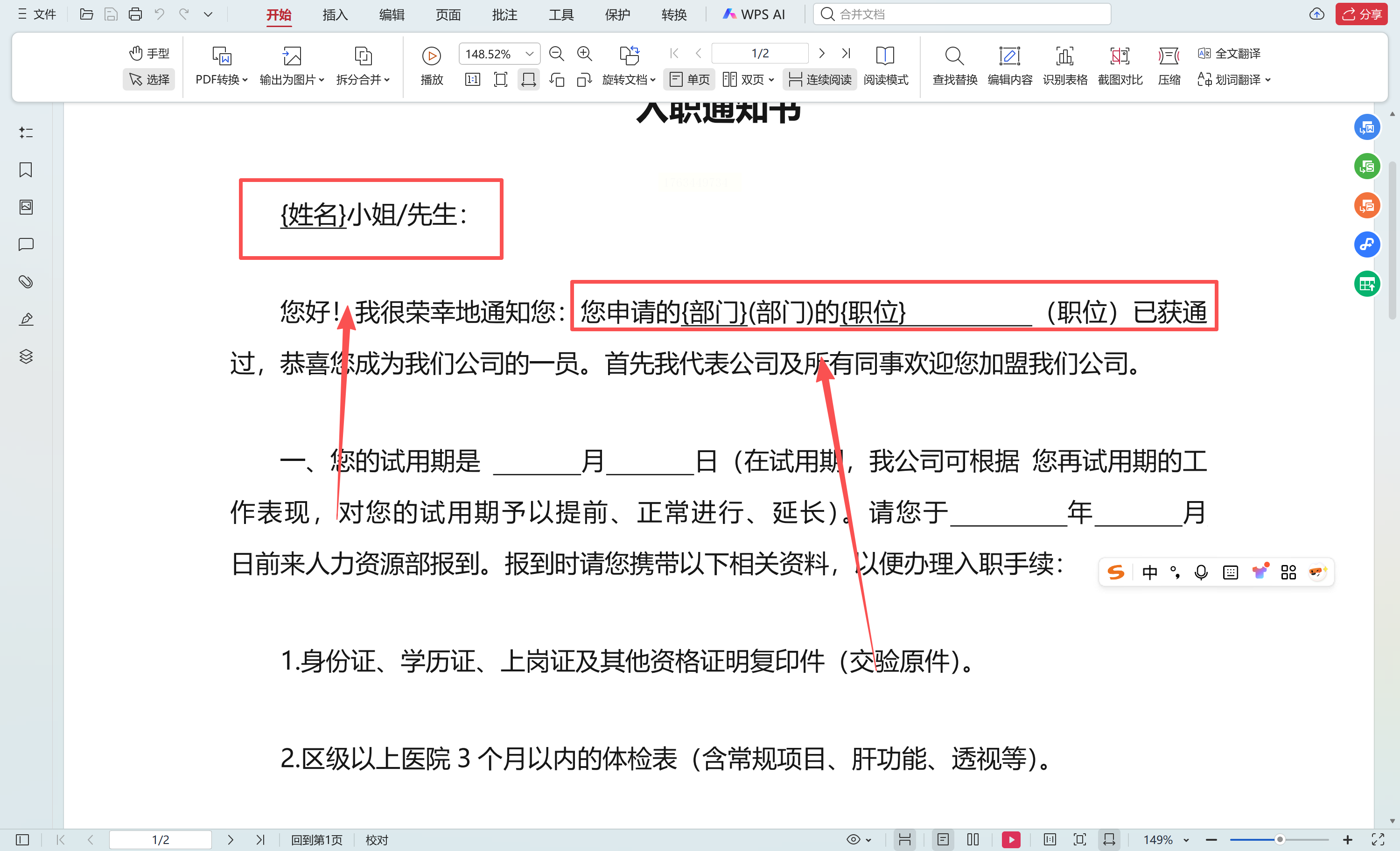 1. 模板准备:在Word中设计固定格式模板,在需填充数据处预留占位符(如``、``)
