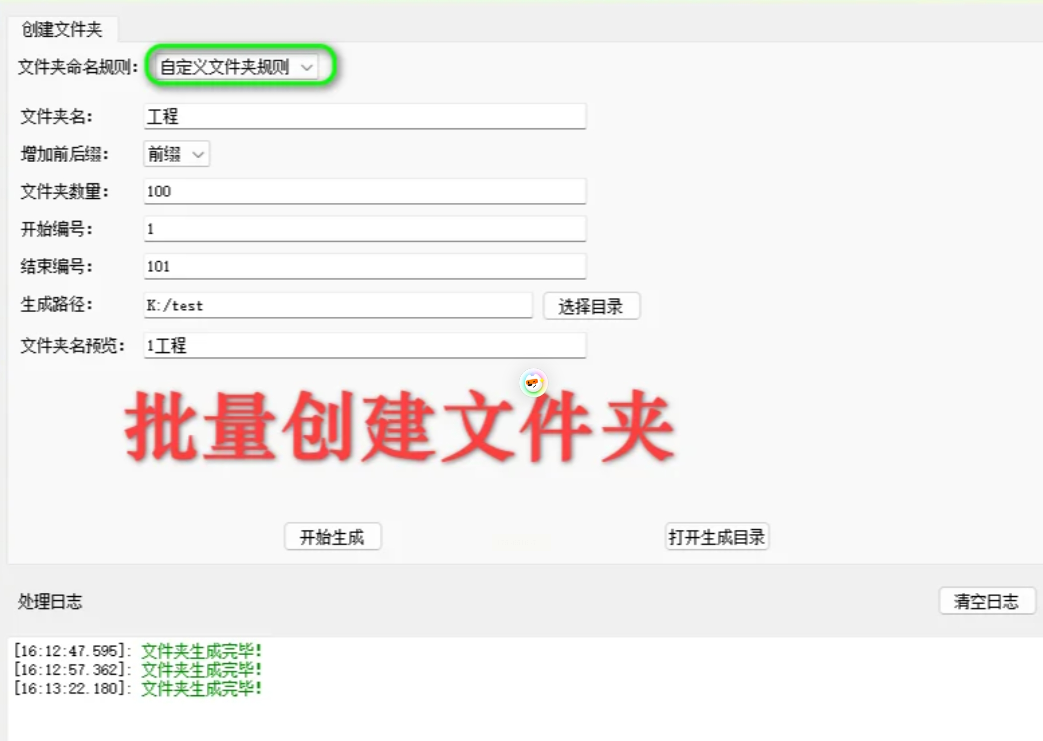 点击“开始生成”按钮,软件会根据你的设置开始批量生成文件夹。这个过程可能需要几秒钟到几分钟,具体时间取决于你生成的文件夹数量和电脑性能。