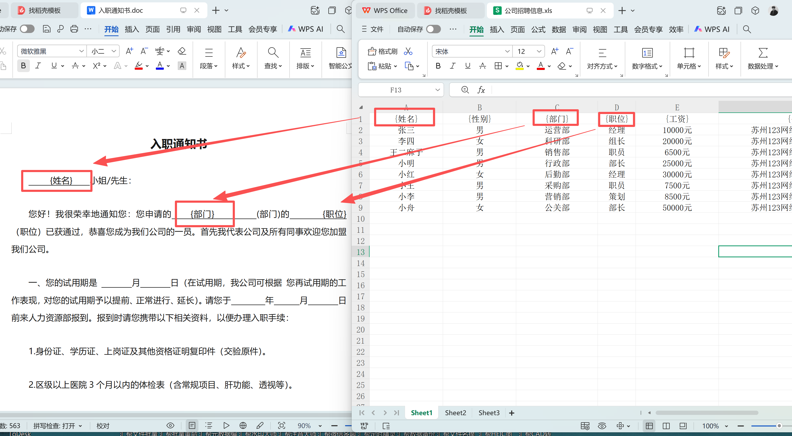 - 注意:数据格式需与Word模板中的占位符完全对应(如“{{姓名}}”)