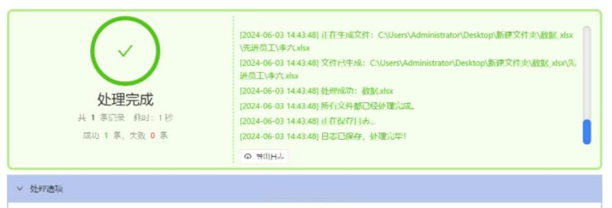 最后,点击“开始处理”按钮。等待进度条完成,出现“处理完成”提示后,所有文档就生成好了。