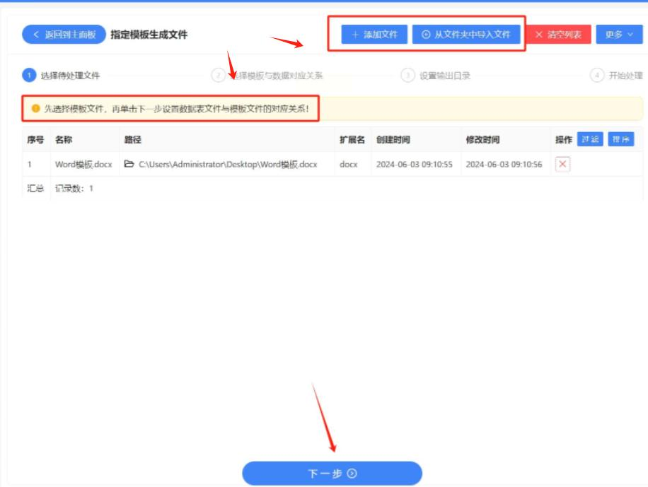点击“添加文件”按钮,上传你的Word模板。或者,直接把文件拖放到指定区域。上传完成后,点击“下一步”。