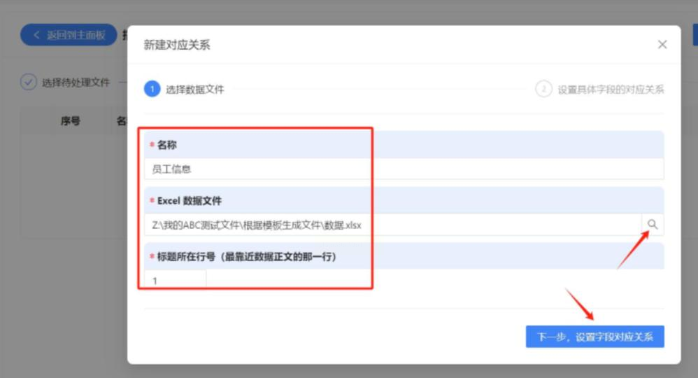 这一步需要关联模板和数据。点击“新建对应关系”,填写名称,然后上传Excel数据文件。设置标题行号,并建立字段对应关系。
