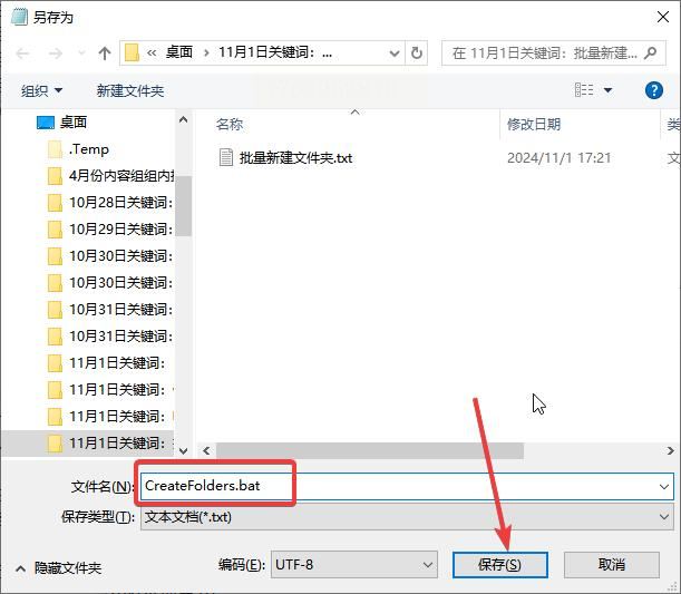 按Ctrl+S,文件类型选“所有文件”,文件名改成“CreateFolders.bat”(后缀必须是.bat),放在你想建文件夹的位置,比如“桌面”。
