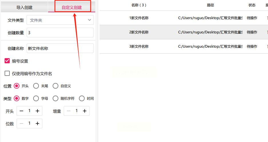 - 创建名称:这里可以写基础名称,比如“项目01”“客户资料”,如果要带序号(像001、002这样),直接在后面加“{序号}”,软件会自动生成;