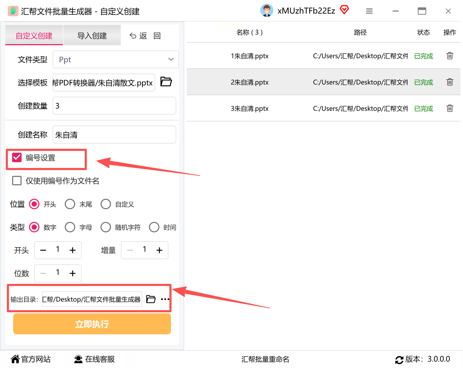 设置生成文件数量(如100份)、自定义文件名格式(如“{部门名称}_2024_汇报”),并选择存储路径(可自定义文件夹结构或使用系统默认路径)。若需编号递增,可在“编号规则”中设置起始值与步长。