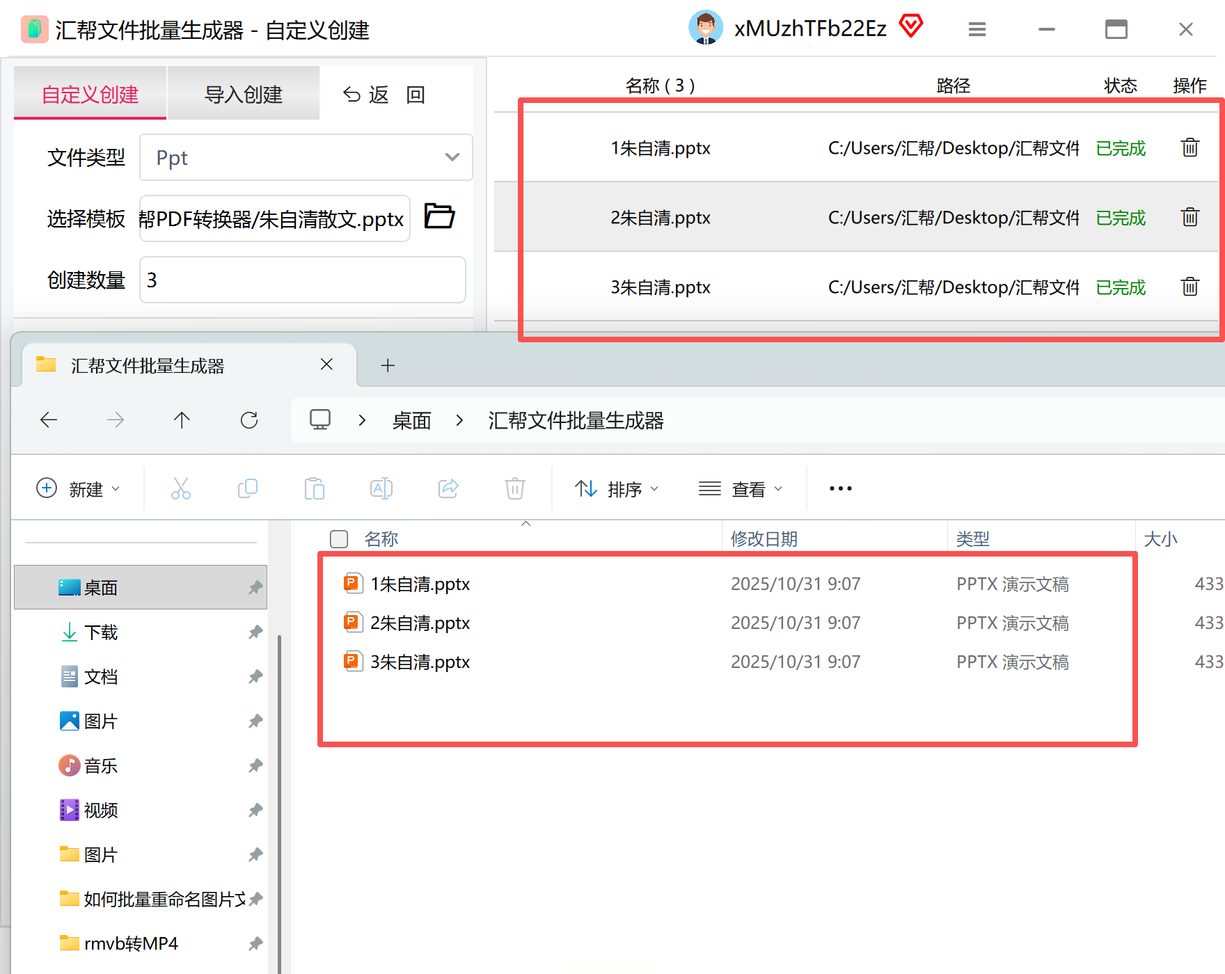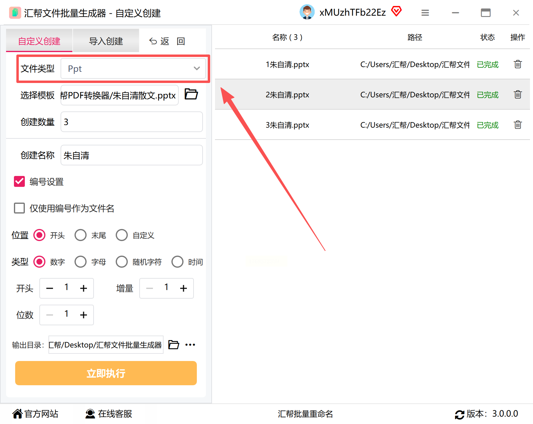 通过正规软件平台搜索“汇帮文件批量生成器”,完成下载安装后打开软件。选择“自定义创建”功能,系统会自动识别支持的文件类型(包括PPT、Word、Excel等)。