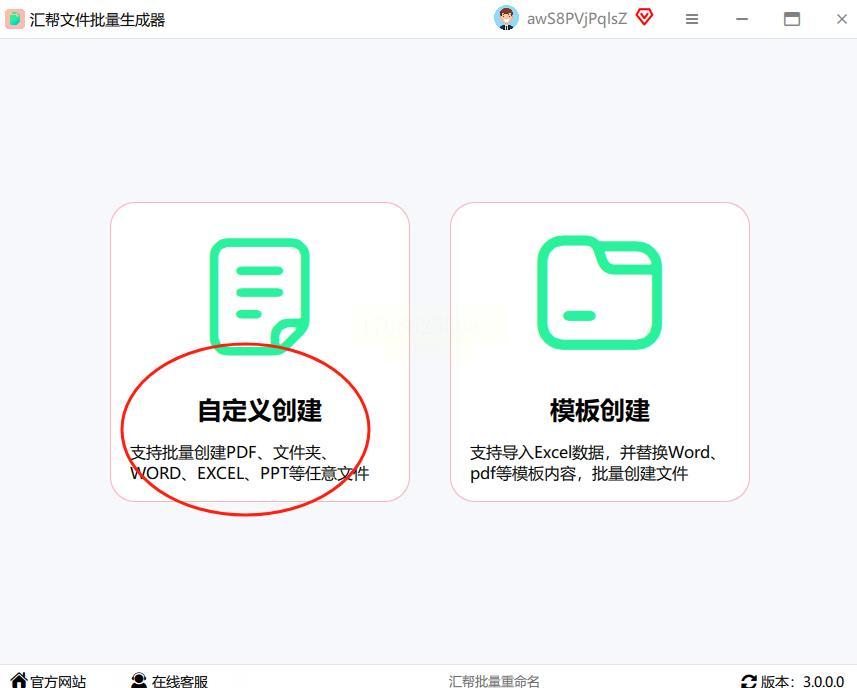 打开“汇帮文件批量生成器”,主界面会有“自定义创建”“批量重命名”等选项,点击“自定义创建”进入下一步。