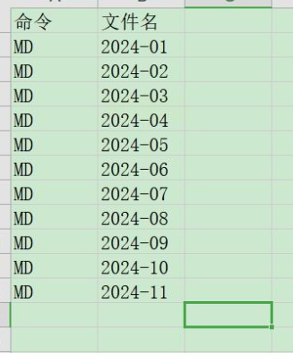 在Excel中输入第一列文件夹名称,在第二列输入公式`="MD "&A2`(假设A2为第一个文件夹名称),按回车后使用Ctrl+E自动填充到所有行。这会生成DOS命令中的创建文件夹指令。