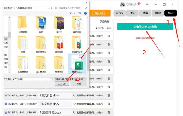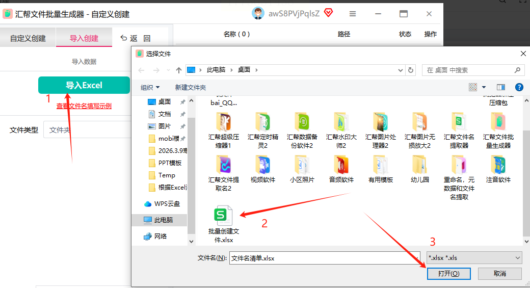 在"导入文件名"区域点击"导入Excel表格"按钮,找到刚才保存的Excel文件。软件会自动识别表格中的数据列,默认第一列即为文件夹名称。如果Excel中有多列数据,可通过勾选"指定列"来选择需要使用的列。