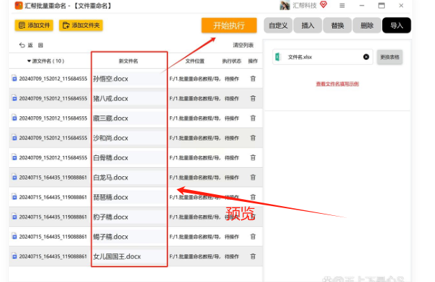 在界面右侧设置"扩展名格式"为"自定义",并勾选"从Excel导入规则"。系统会自动识别第一行数据作为表头,你可以通过"预览"按钮查看即将生成的文件列表。