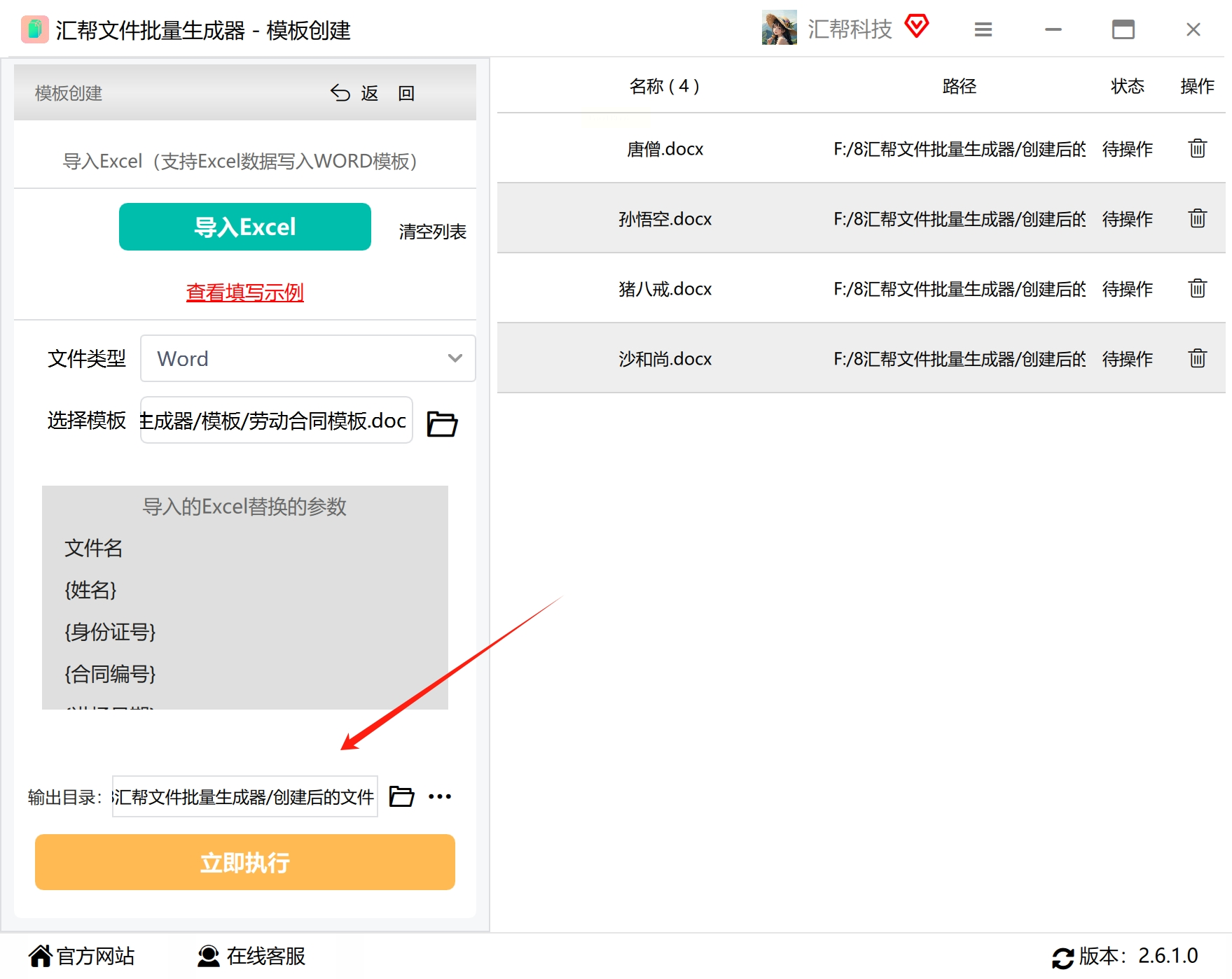 4. 设置输出路径:在软件下方找到“输出目录”,点“浏览”选一个文件夹,比如“我的桌面/批量生成合同”,这样生成完文件就不会到处乱飘,找起来方便。