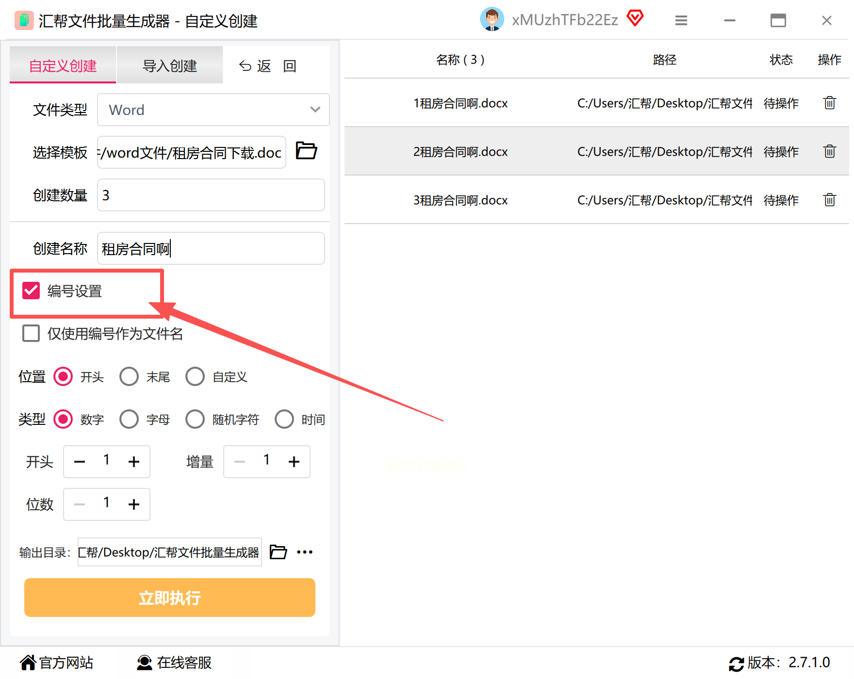 4. 文件名要注意!勾选「编号设置」(比如「合同-001」「合同-002」,这样导出后不会覆盖)