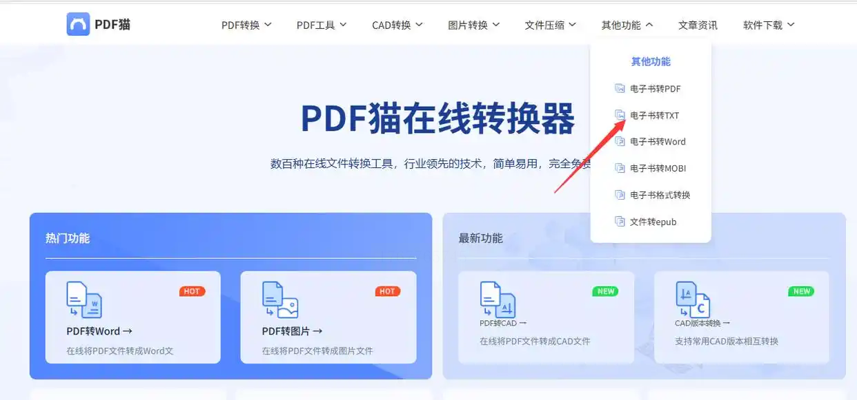 步骤一:打开浏览器,访问pdfmao官网(注意通过正规渠道进入),在首页功能区找到"其他功能",点击"电子书转TXT"选项。