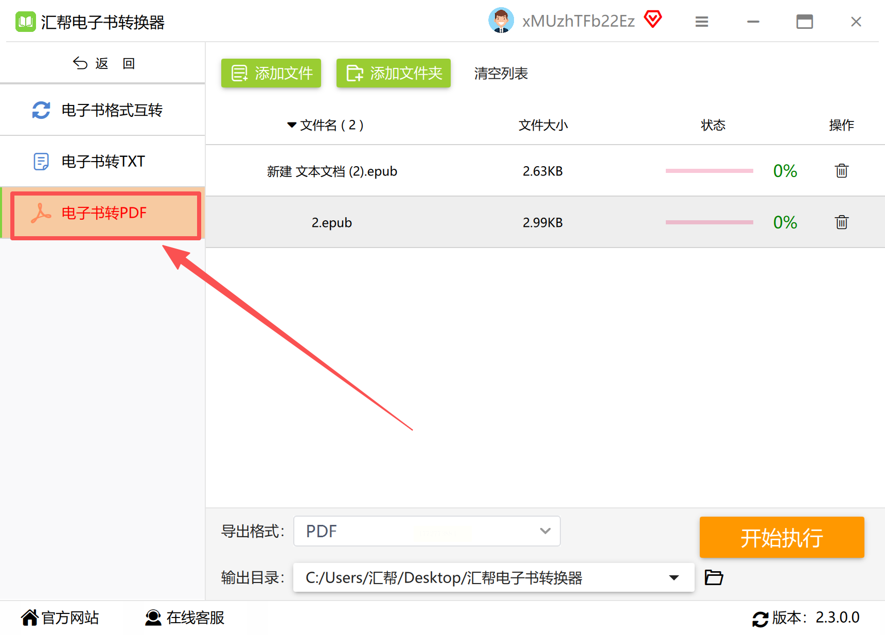 3. 添加文件:进入之后,选择左侧的电子书转pdf