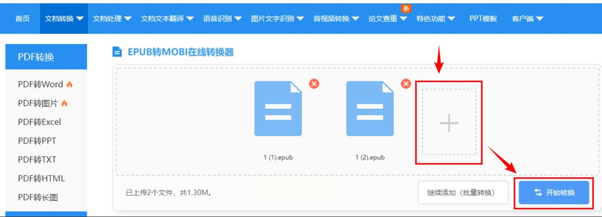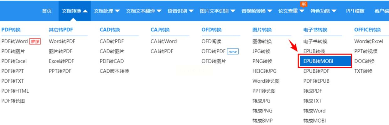 2. 选择转换功能: 在页面上的“文档转换”下拉菜单中,找到并选择“epub转mobi”。