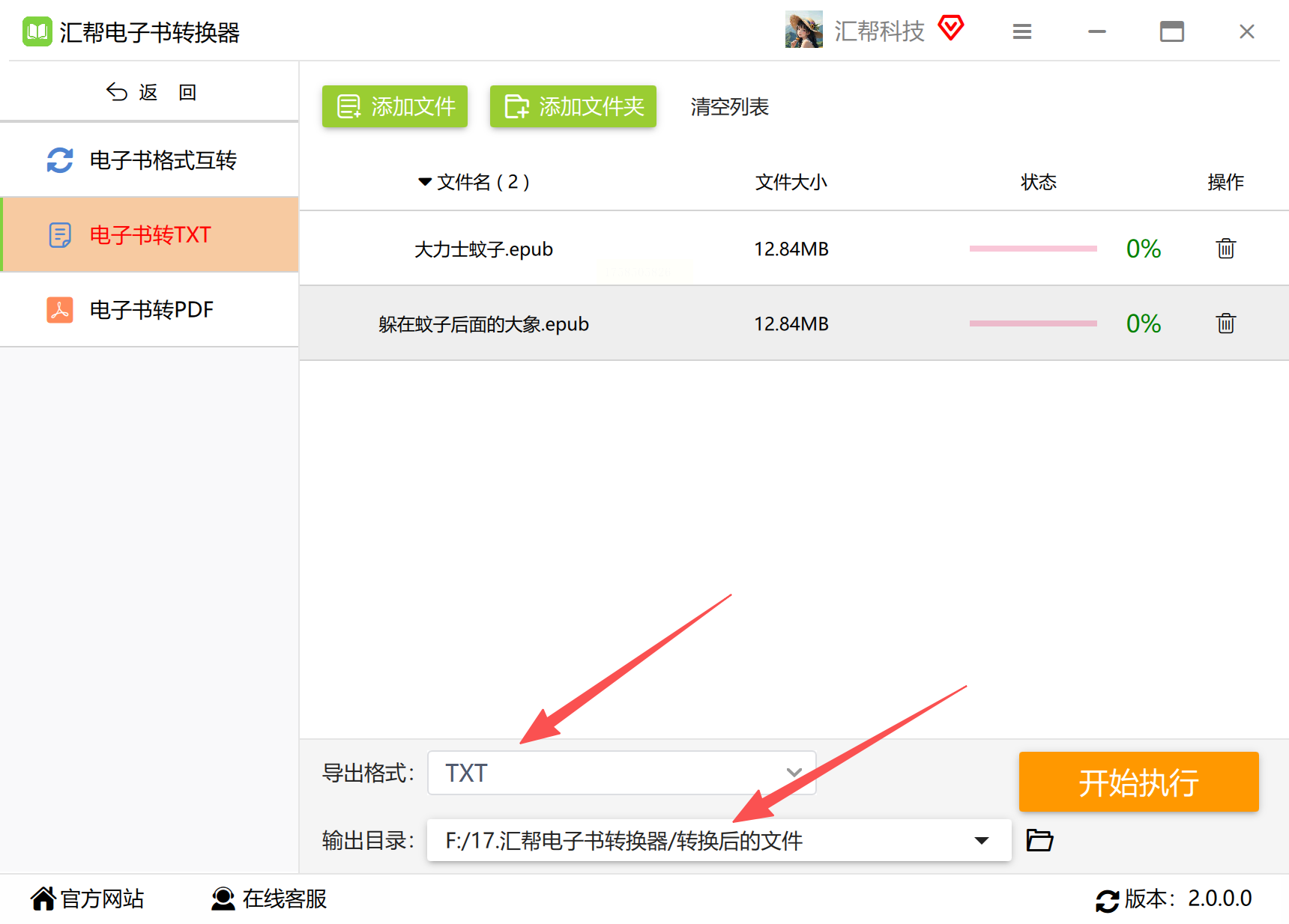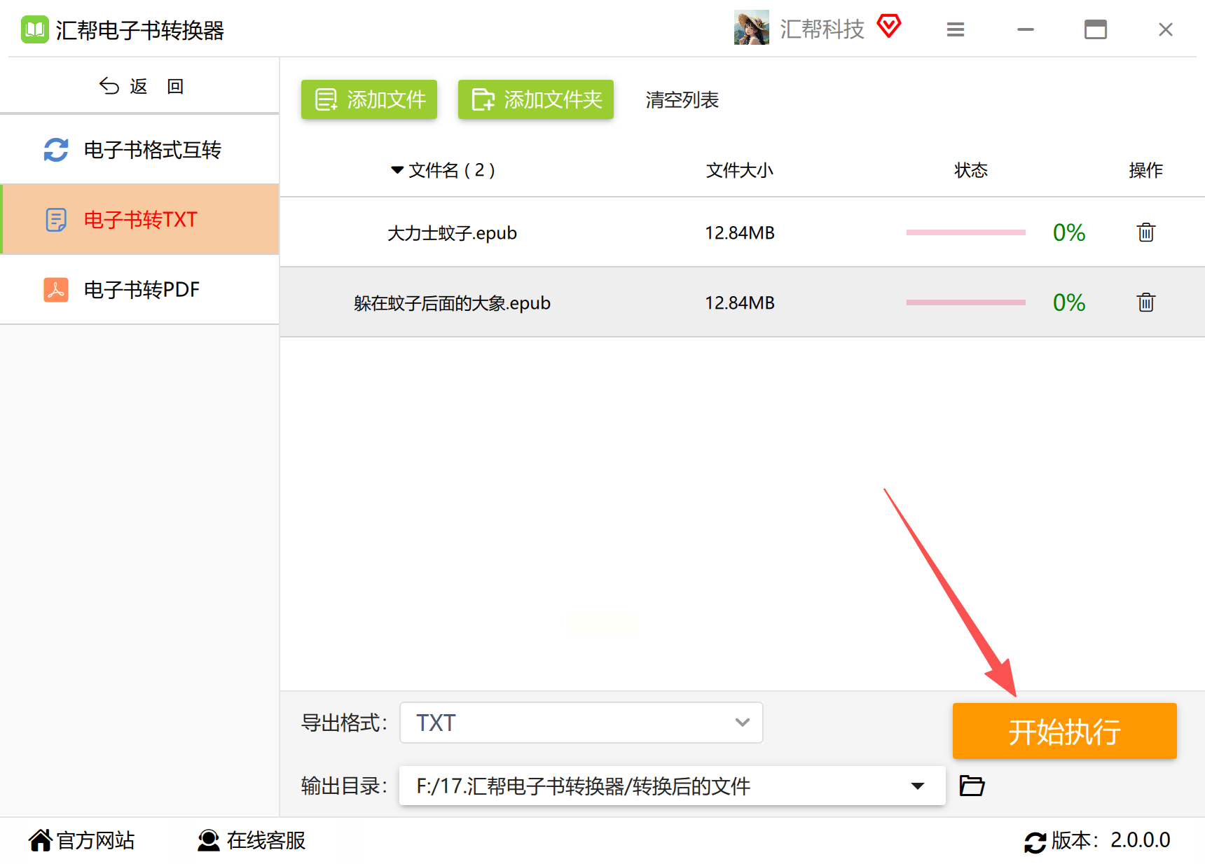 文件添加后,在底部“导出格式”下拉菜单中选择“TXT”(注意确认不是其他格式,比如PDF或MOBI)。下方“输出目录”可以点击自定义,建议选个自己容易找到的位置(比如桌面新建个“转换后的TXT”文件夹),方便转换后查找。