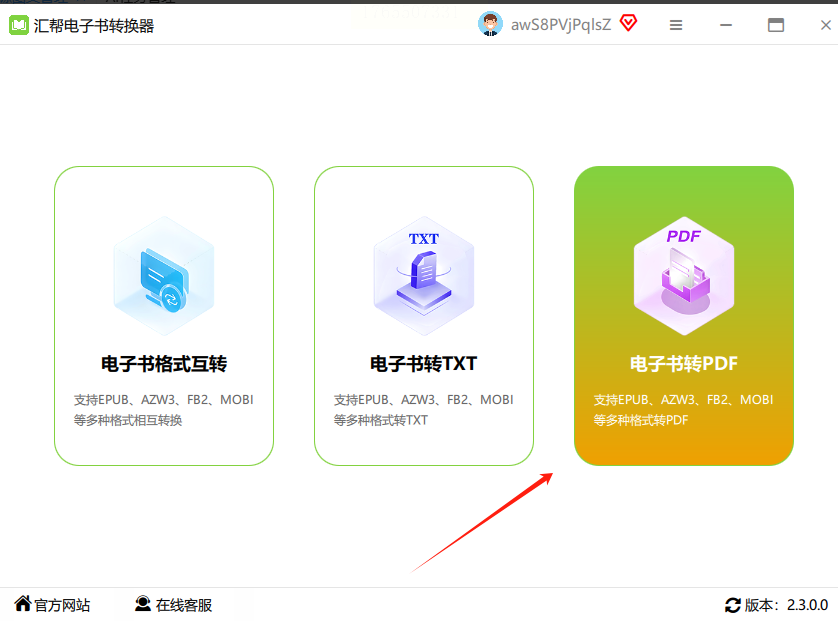 首先,在电脑上打开“汇帮电子书转换器”。软件界面通常很直观,你一眼就能看到“电子书转PDF”或类似的醒目选项。直接点击它,进入核心操作区。