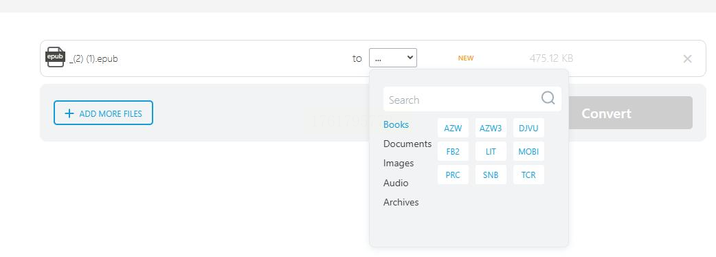 3. 上传文件:点击右侧“添加文件”按钮,导入需要转换的电子书(支持EPUB、MOBI、PDF等常见格式),可同时选中多个文件批量上传。