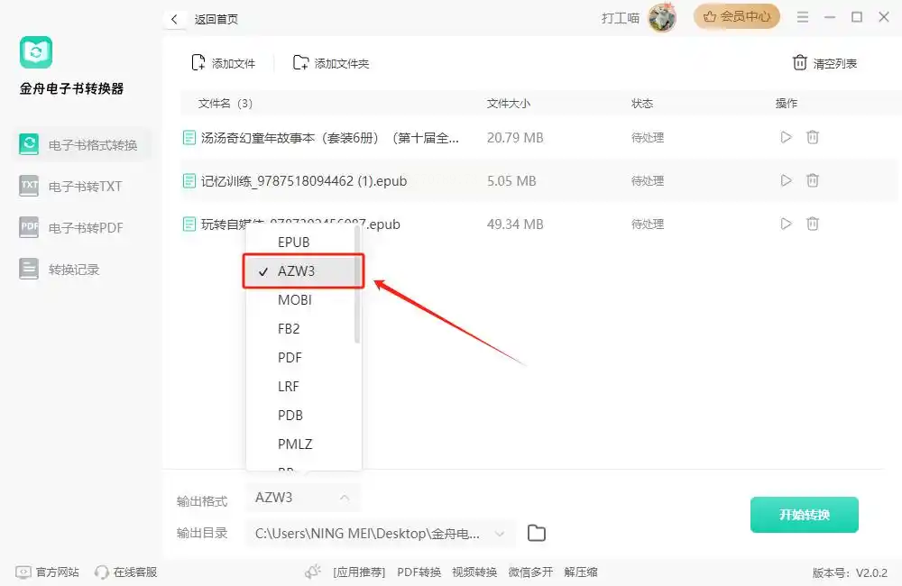 3. 参数设置:在格式下拉框选「AZW3」,设置输出路径(默认桌面,可自定义)。