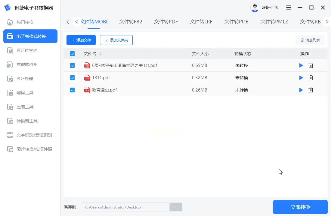 步骤一:在浏览器中打开迅捷电子书转换器网站,页面设计干净,功能一目了然,左侧导航栏提供了丰富的格式处理选项。