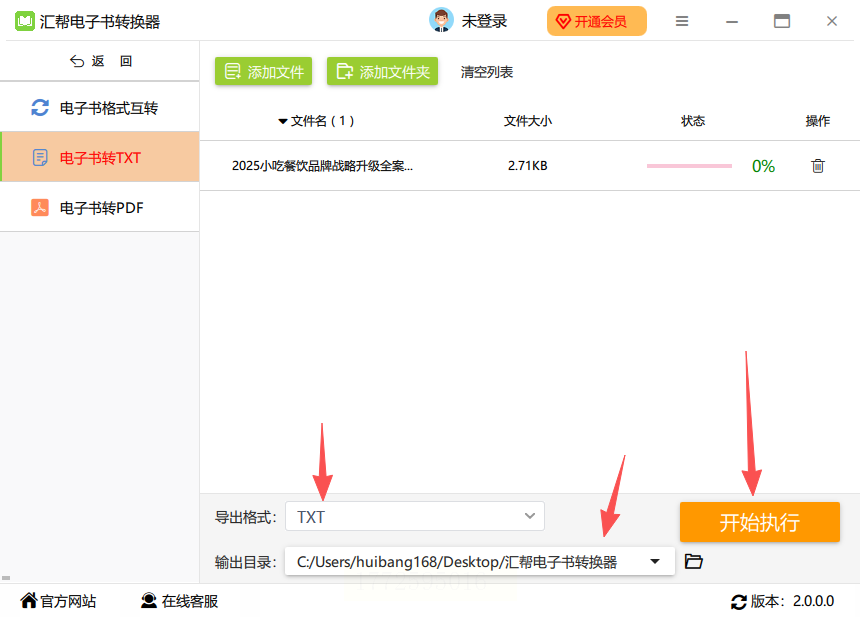 3. 确认输出格式是TXT,选个保存文件夹,点开始转换就行