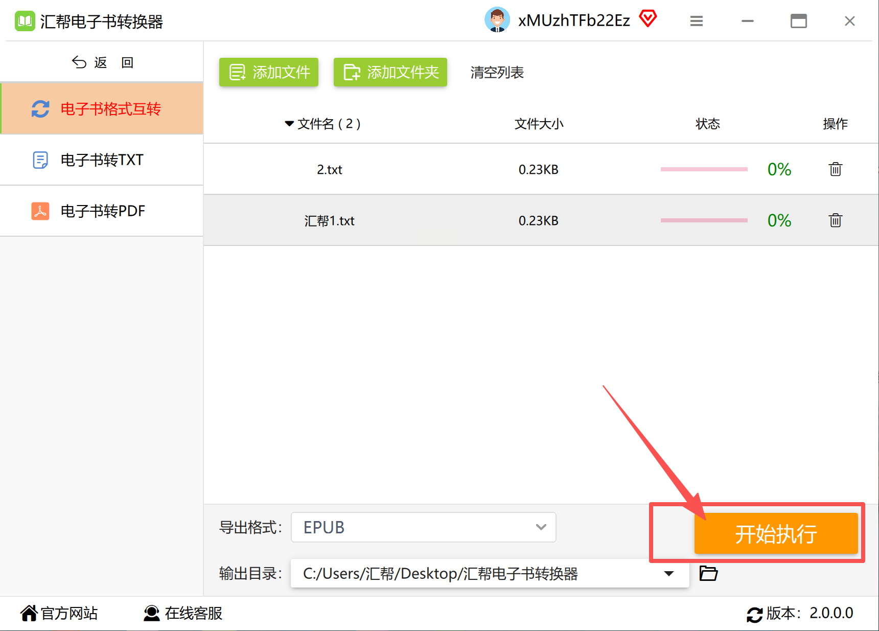 - 系统默认转换格式为epub,确认无误后点击“开始转换”;