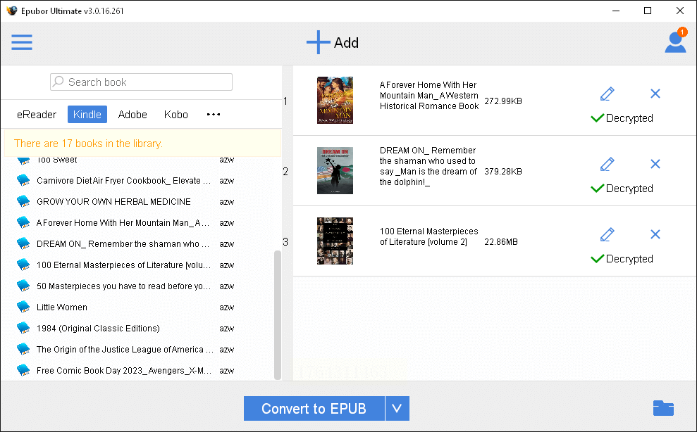 作为专业级电子书工具,它能自动识别亚马逊DRM保护格式,转换时无需手动处理版权问题。支持批量转换,转换后的文件会自动保留原书的章节结构,让你阅读时能清晰定位内容。操作步骤与汇帮类似,先导入文件再选择格式和路径。