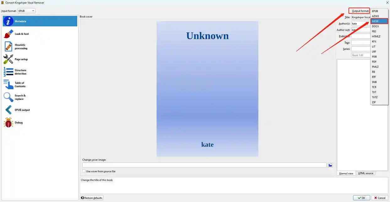 步骤四:在设置窗口的右上角,找到“输出格式”选项,从下拉列表中选择“MOBI”。