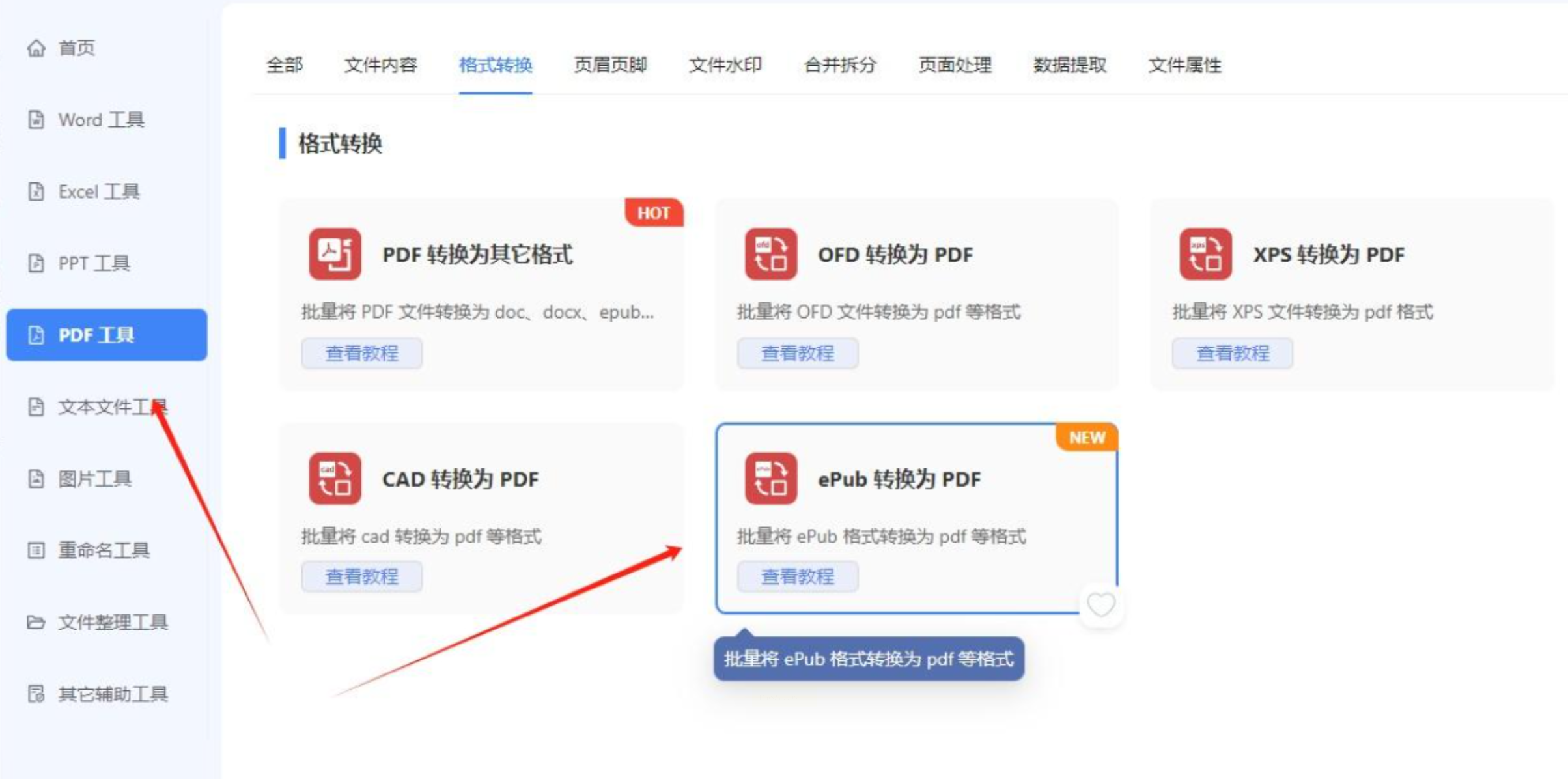 步骤一:运行鹰迅批量处理工具箱软件。在左侧功能列表中,找到并点击“PDF工具”分类。然后在右侧面板中,浏览格式转换选项,选择“ePub 转换为 PDF”功能入口。