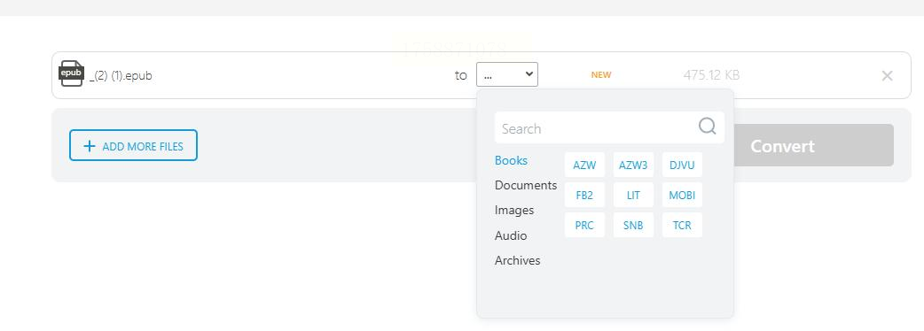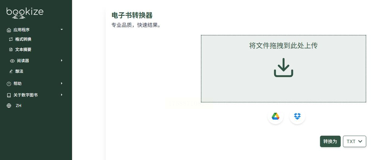 步骤二:点击上传按钮,把你的EPUB文件拖进去,然后在输出格式里选择TXT。