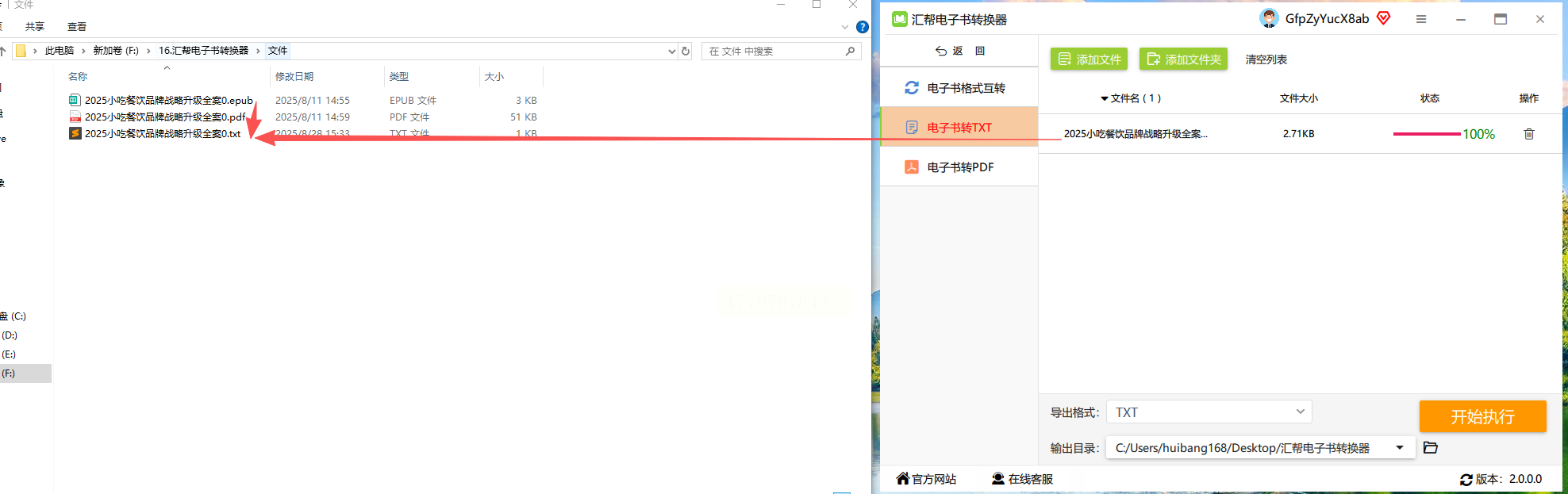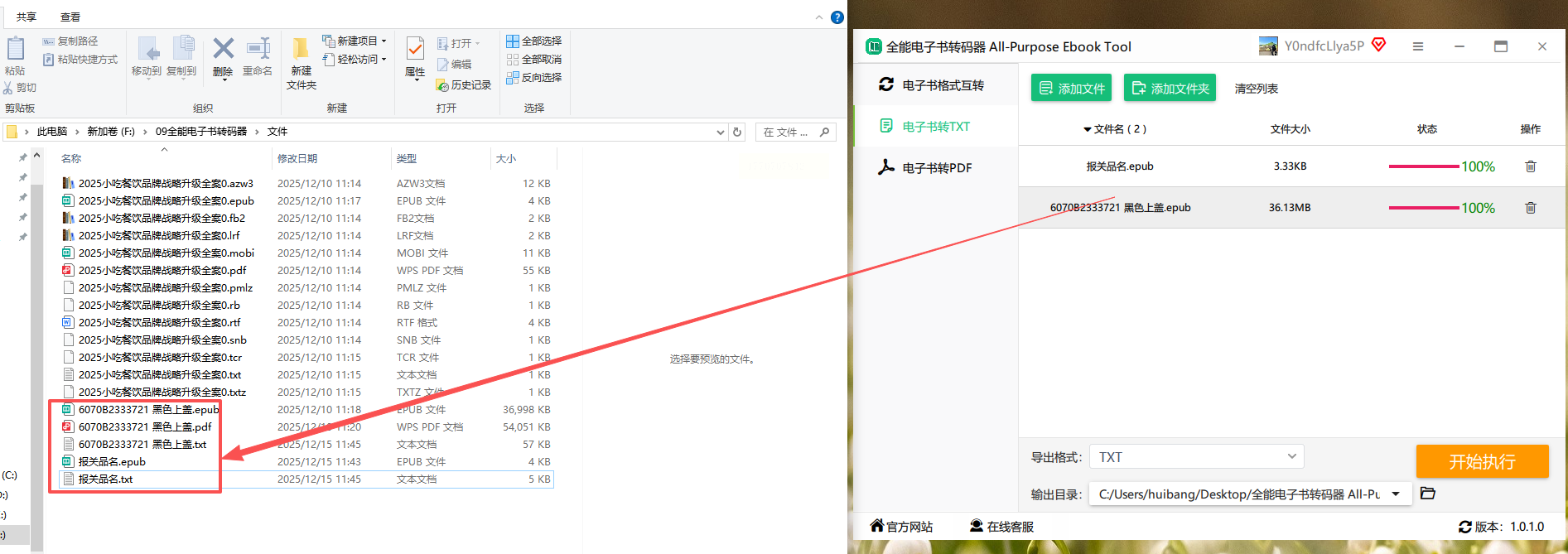 4. 点击"开始执行",转换完成后会弹出成功提示,txt文件自动保存到指定文件夹。